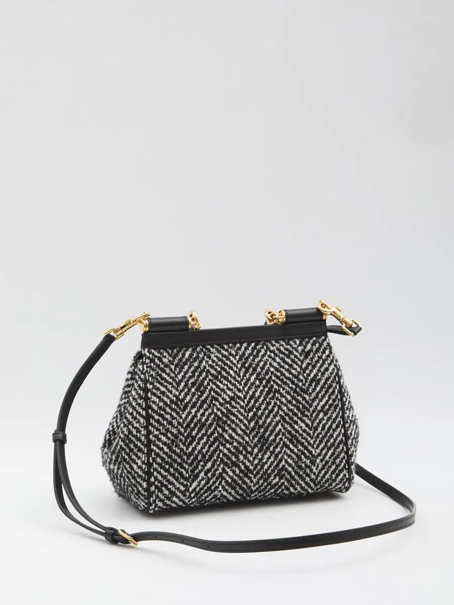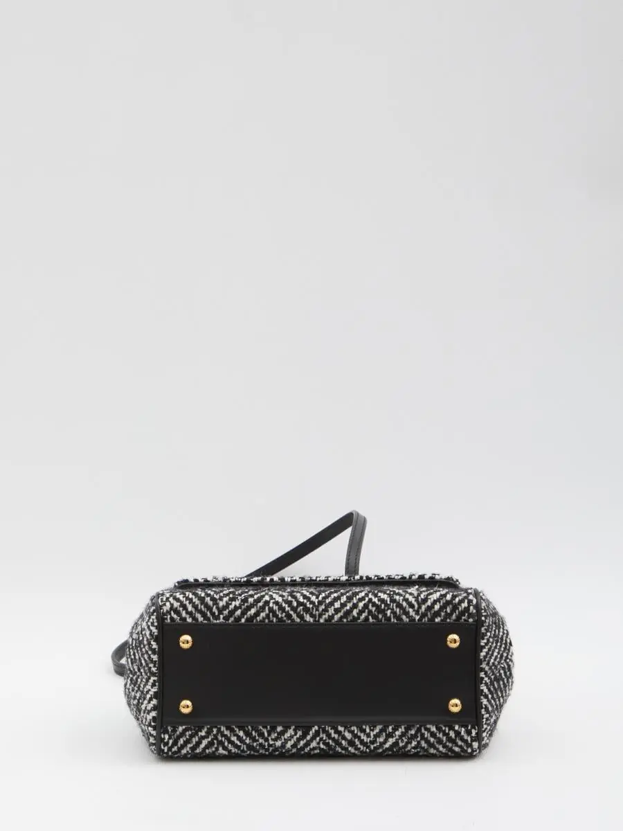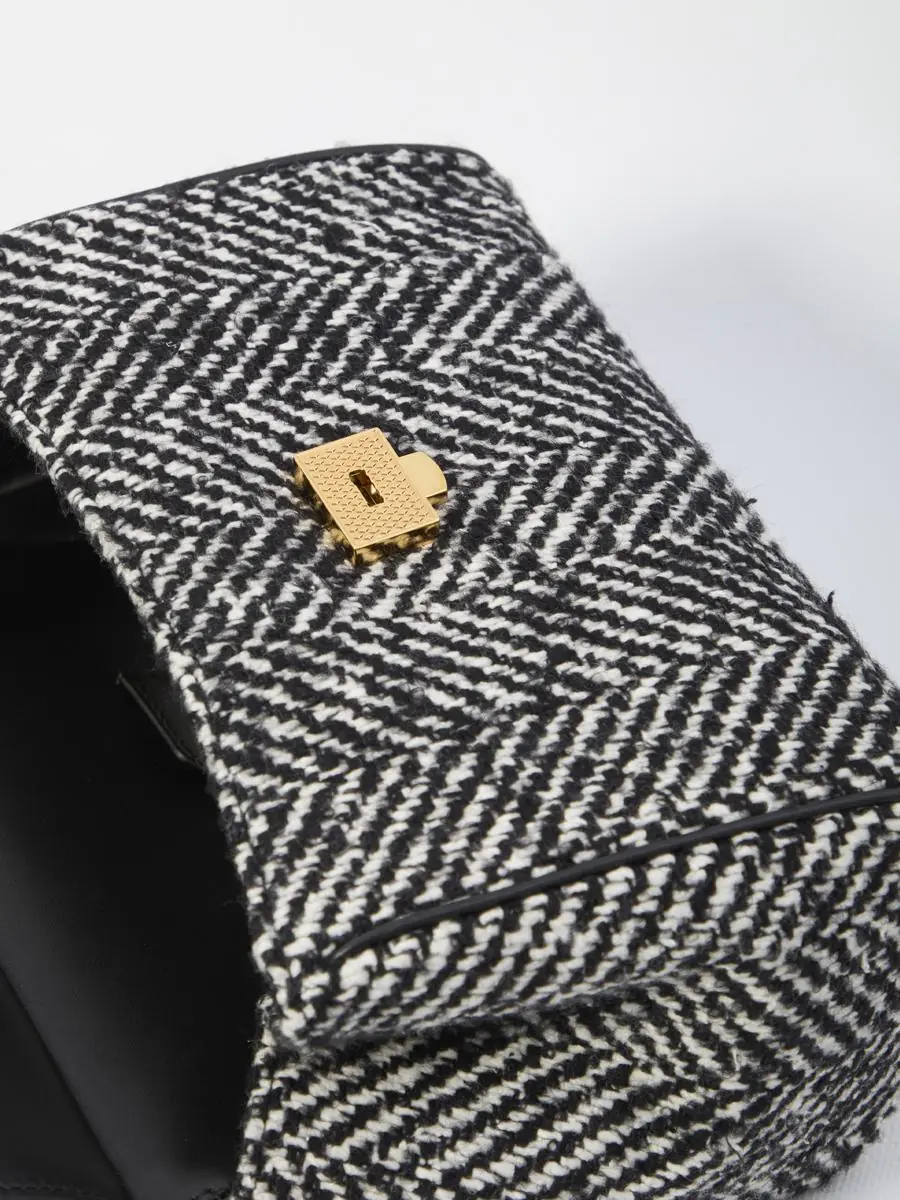 Bag in wool chevron fabric and calf leather in black and white tones. Features leather top handles and a removable, adjustable shoulder strap, tuck-in closure, vintage brass hardware, one main compartment with two flat pockets, and brass feet. Dust bag included. Any imperfections in the leather are not to be considered defects, but rather a characteristic of the material.