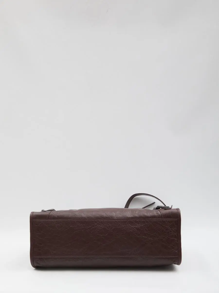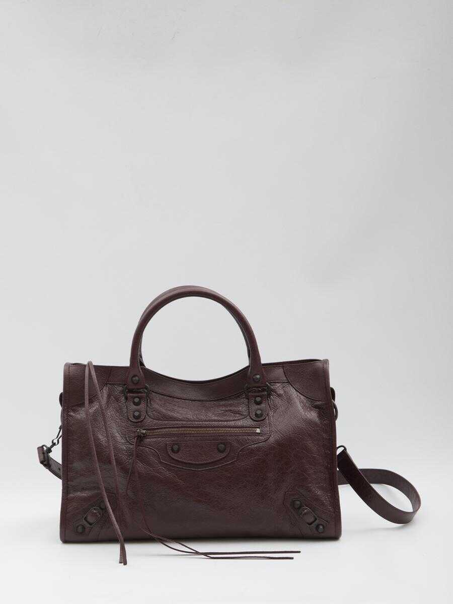 Le City bag in bordeaux Arena lambskin leather with matte black brass hardware. Features double hand-braided leather handles, a removable and adjustable shoulder strap, a front zip pocket, zip closure, a spacious main compartment, and an internal zip pocket. Lined in cotton canvas. Dust bag included. Any natural imperfections in the leather are not considered manufacturing defects but a characteristic of the material.