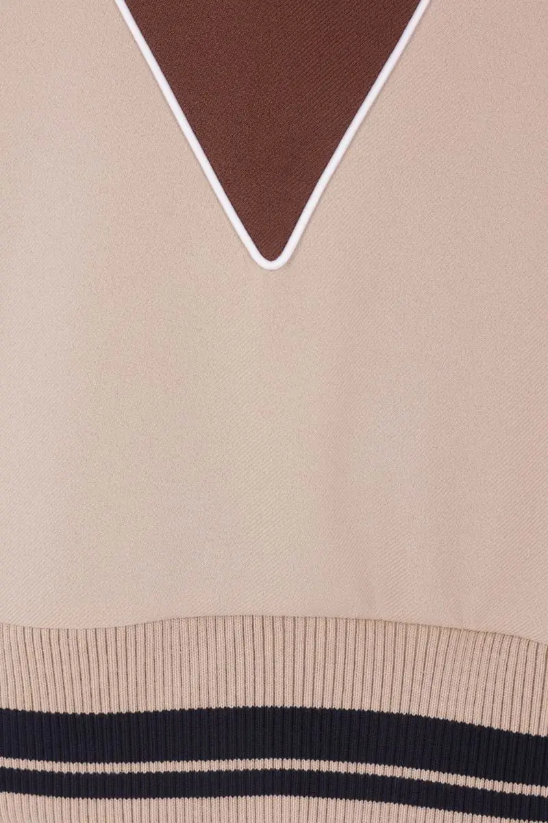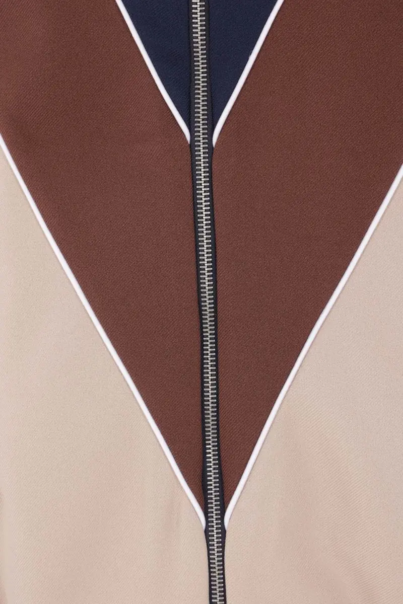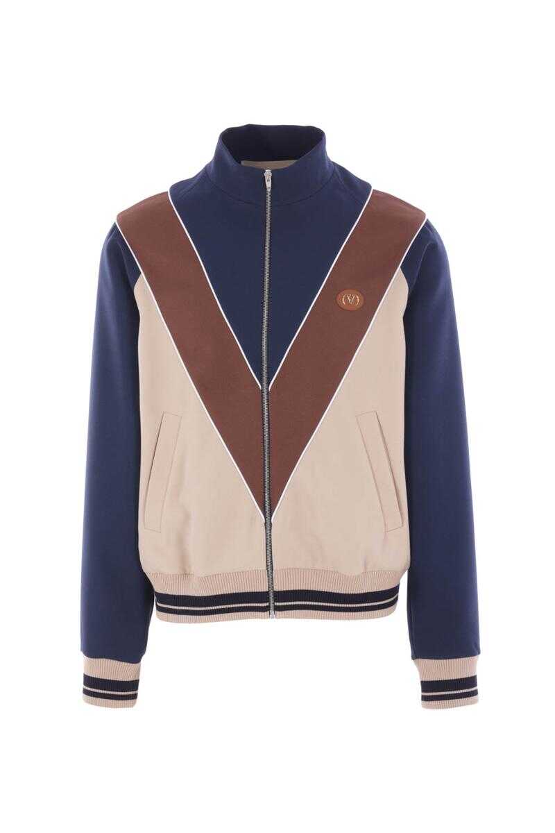 Valentino Garavani sweatshirt made of blue, brown, and beige nylon, featuring a VLogo patch on the chest. Designed with a high collar, front zip closure, welt pockets, long sleeves, and ribbed knit trims with striped detailing. The interior is lined with mesh.