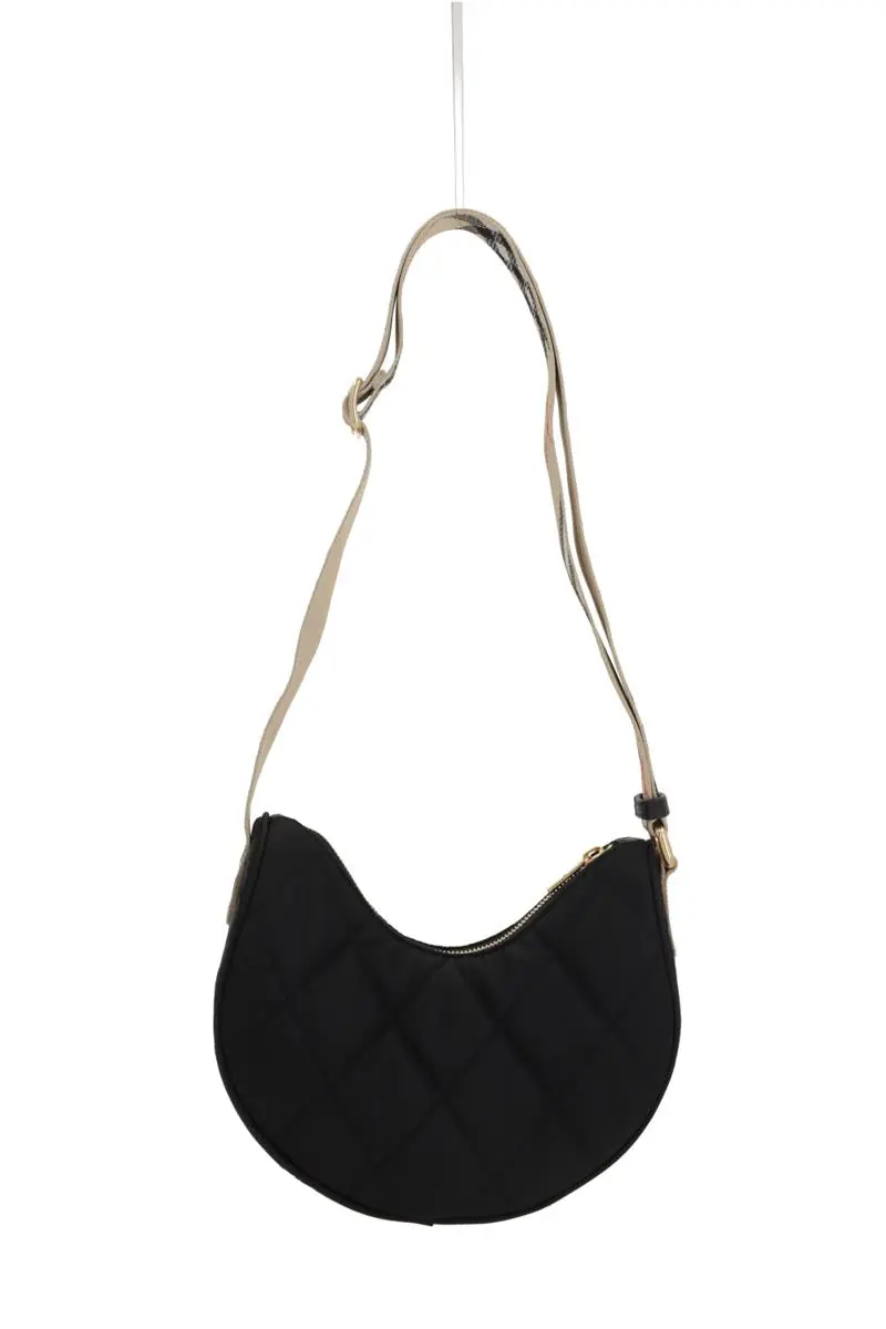 Burberry hobo bag crafted from black quilted nylon. Featuring gold-tone hardware, zip closure, and an adjustable strap woven with the Burberry Check. Tonal interior. The design is completed with a leather patch showcasing the Equestrian Knight Design on the front.