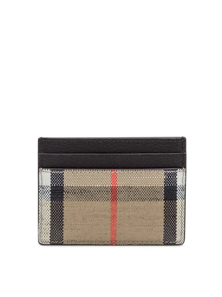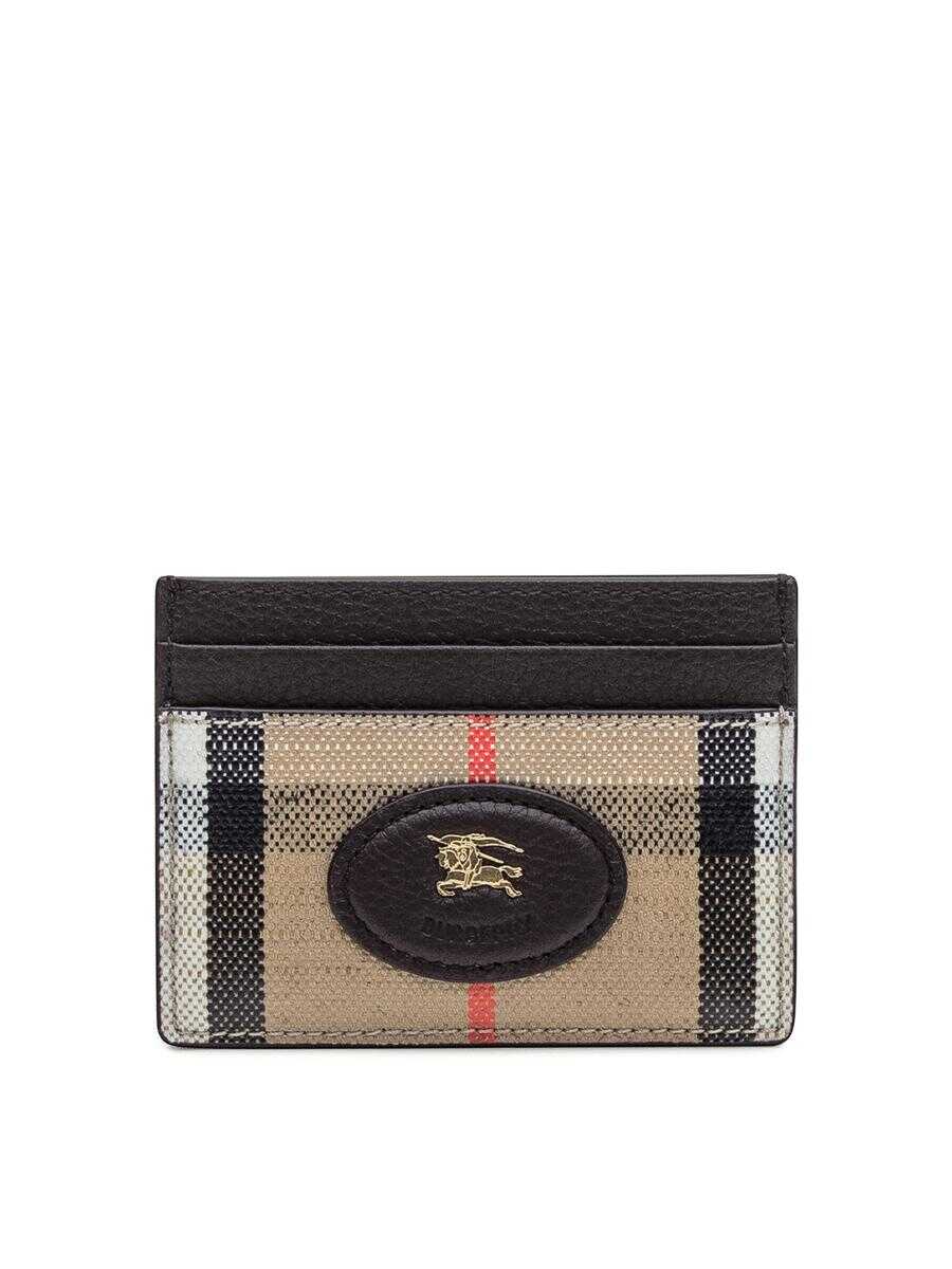 Burberry card case in beige check canvas with brown leather inserts. Features embossed gold knight logo and multiple card compartments. Width: 10Height: 7.5Depth: 0.5
