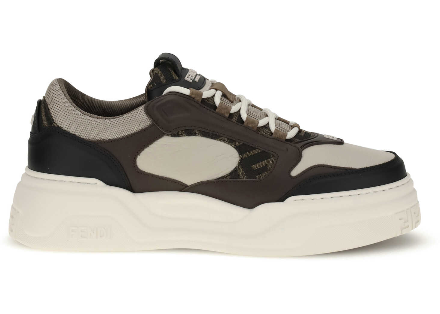 Fendi's leather Sneakers are a perfect example of sophisticated urban style combined with comfort. The paneled design, combining different materials, gives a modern and dynamic silhouette, while the textured sole ensures a comfortable and stable walk. The round toe adds a fresh touch to the design. The front lace-up closure allows for an adjustable fit, while the press-studded logoed insole and label reinforce the brand's understated luxury. An additional distinctive detail is the jacquard fabric panel with the repeated FF logo embedded in the side panels. The logoed sole and logoed insole complete the design, making these sneakers an elegant and recognizable accessory.