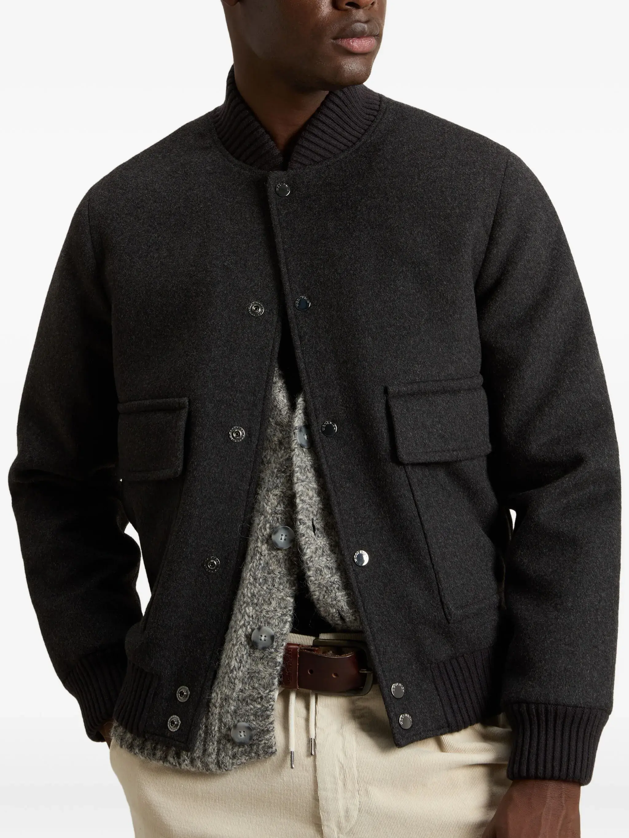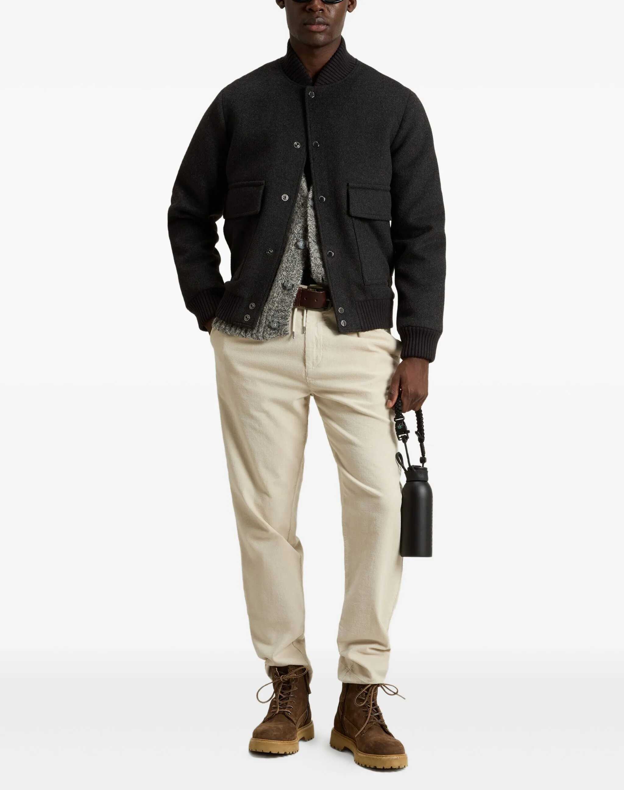 Woolrich's wool bomber Jacket is a perfect balance of classic style and modern functionality. Featuring a ribbed collar and a front snap closure, it has cuffs and hem that are also ribbed for a snug fit. Two patch pockets on the front with flaps complete the design, offering practicality without sacrificing elegance.
