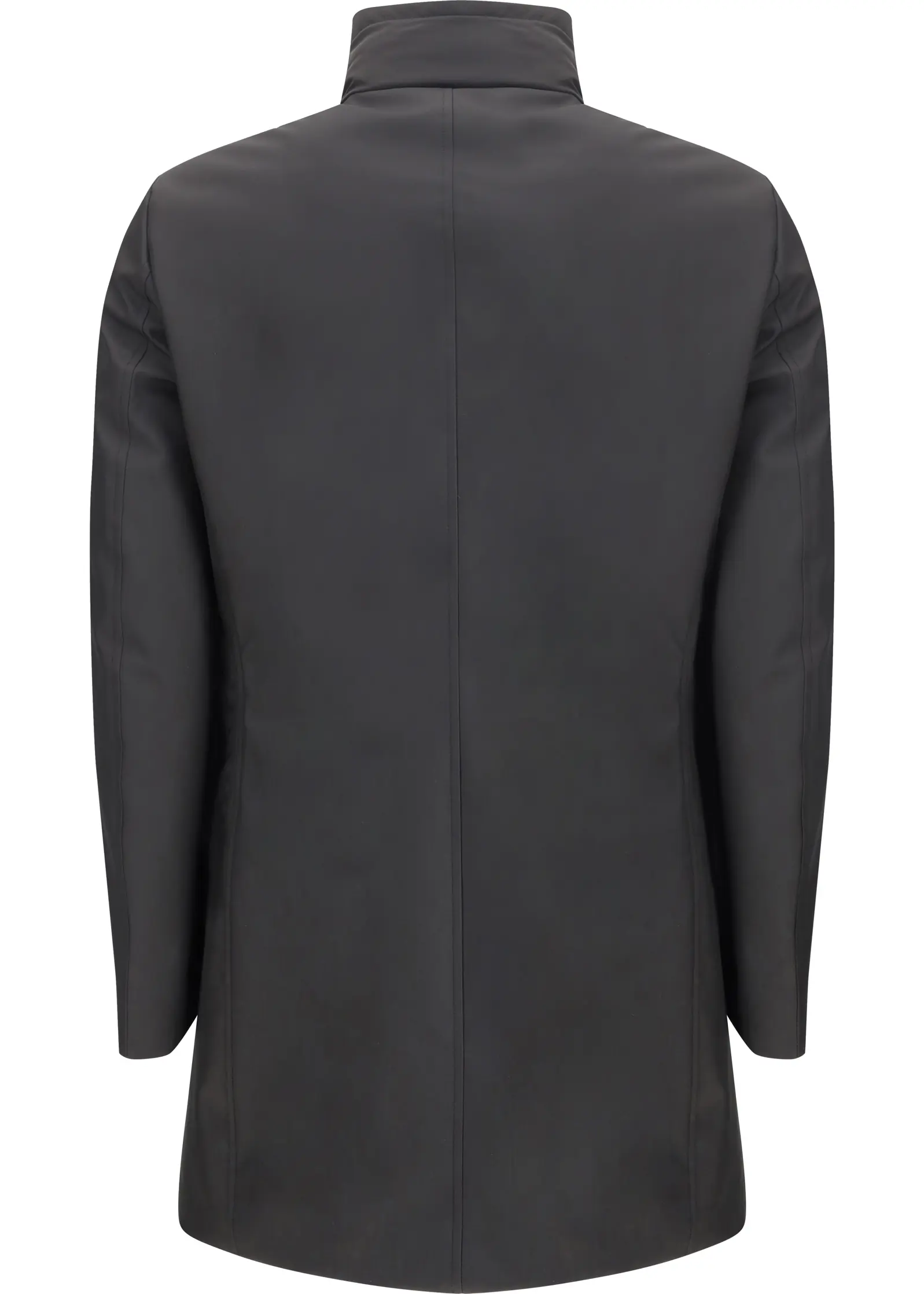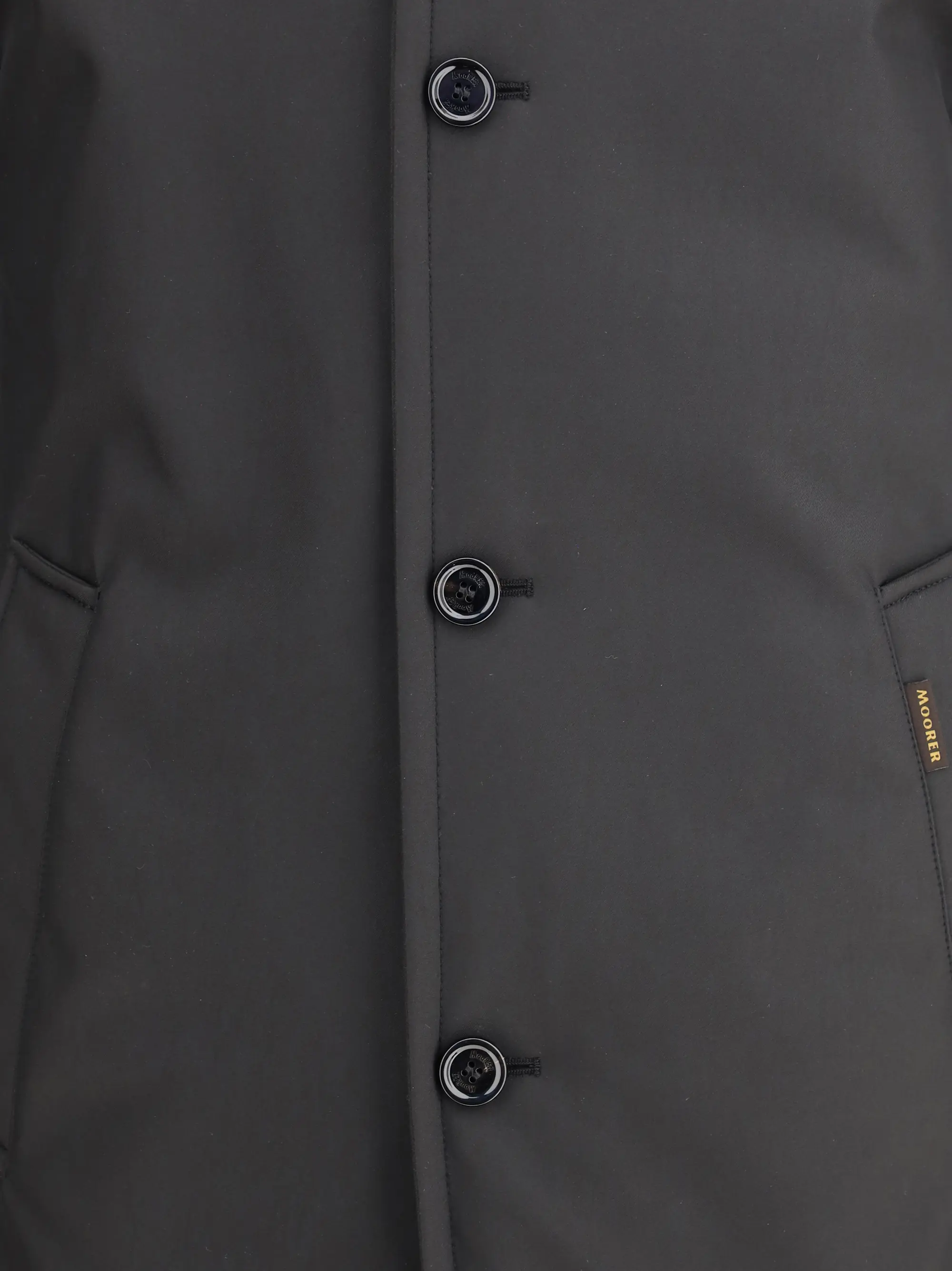 Moorer's Bond-Wi Down Jacket is a technical and functional single-breasted jacket. Made of windproof and water-repellent 3-layer fabric, it is filled with down for lightweight warmth. The banded stand-up collar closes with a stylish leather frog and snap button. The double front closure combines horn buttons and zipper for maximum protection. The side slider pockets have a hidden metal zipper, combining practicality and refined design.