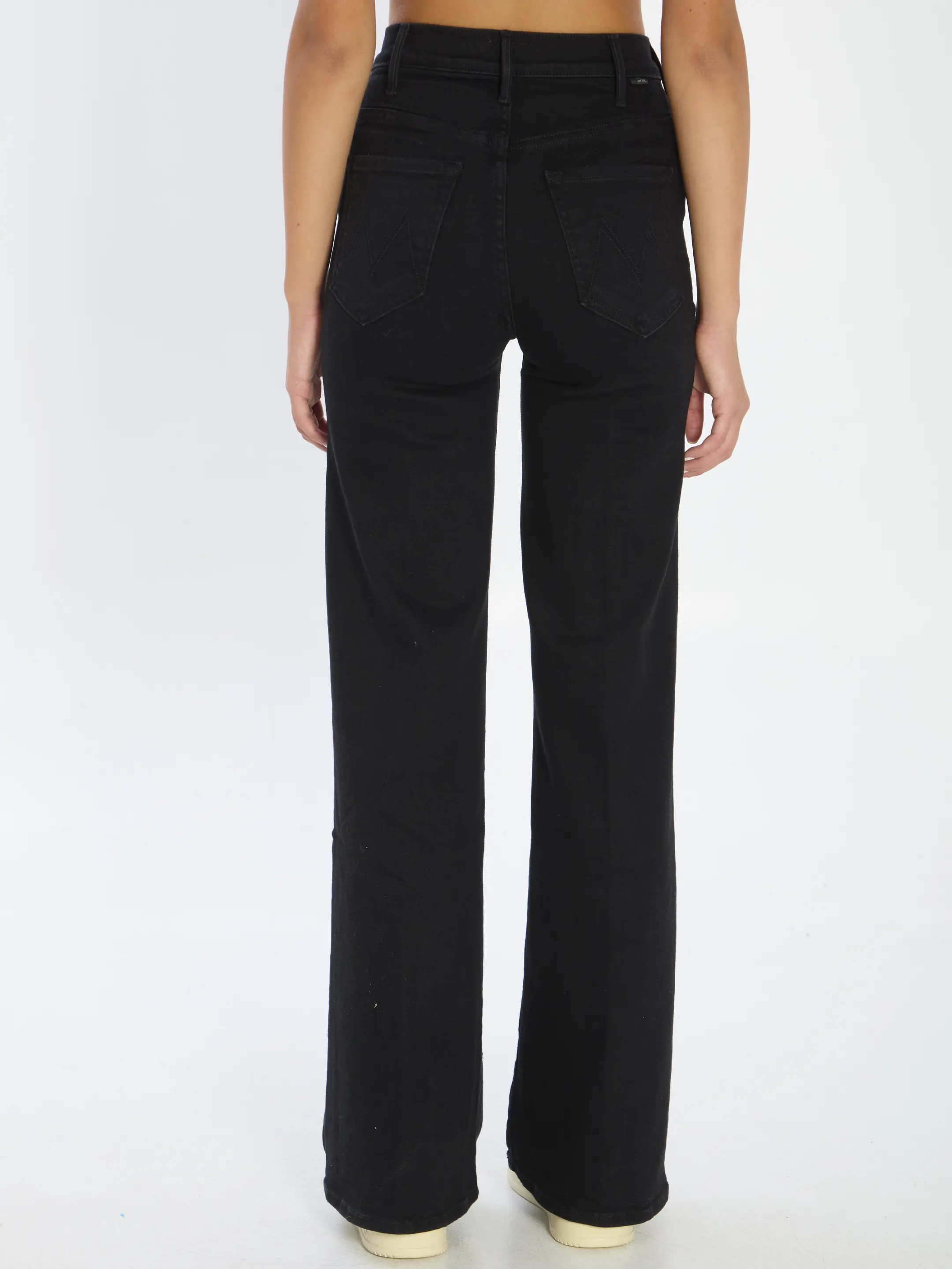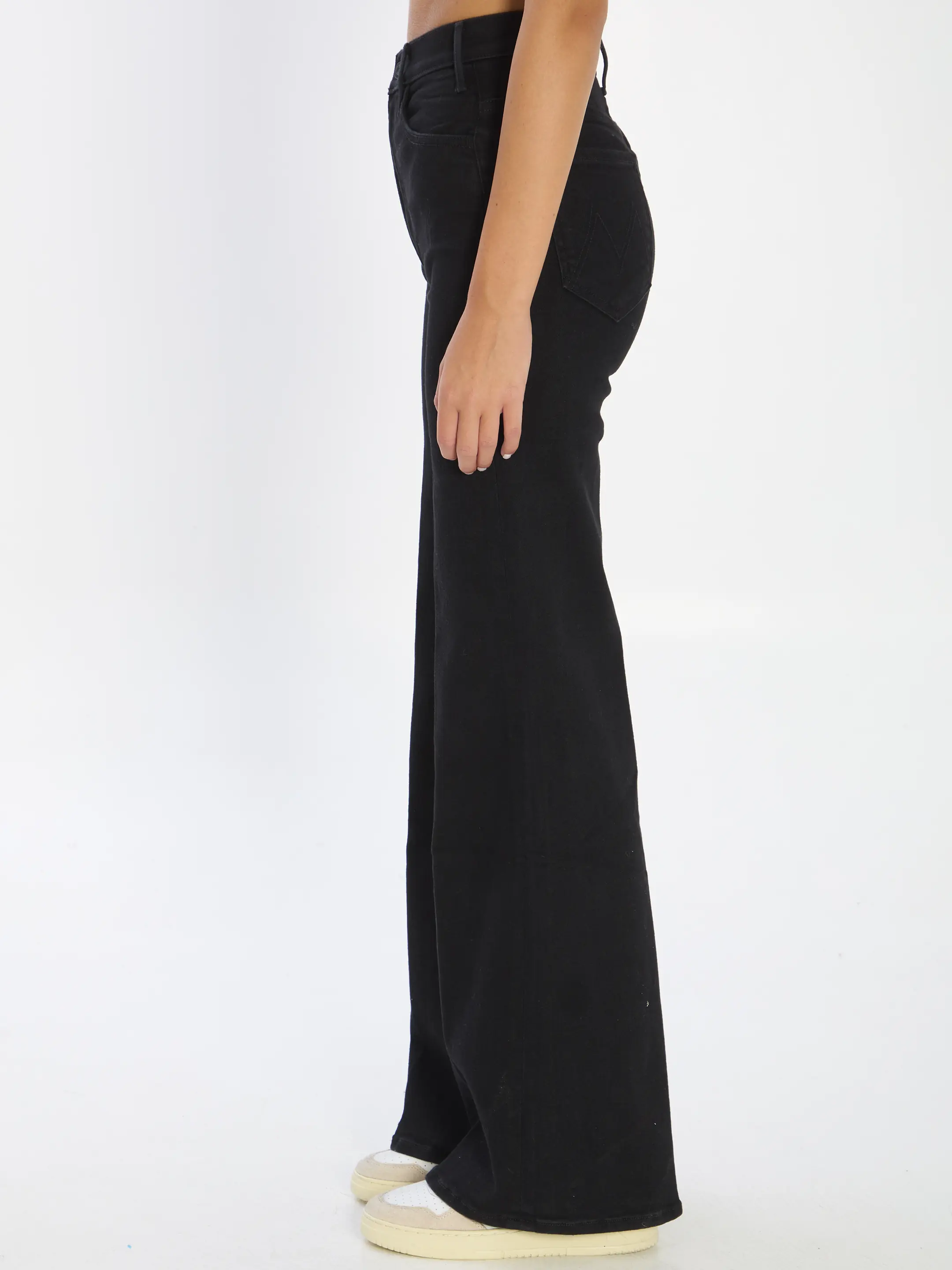 Black slightly stretchy cotton denim jeans. High-rise, wide-leg style. Features belt loops, five pockets, zip and button closure. Regular fit.