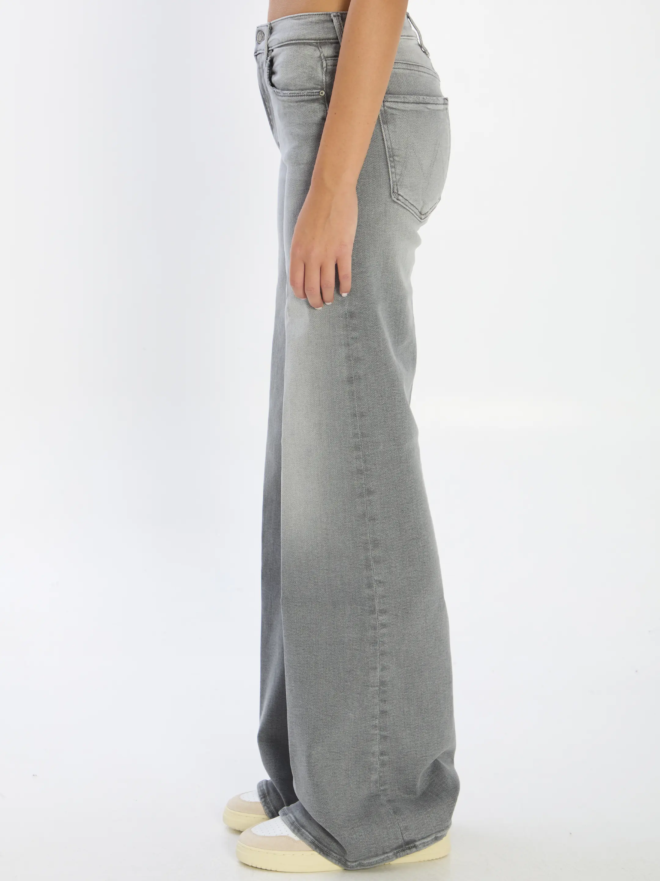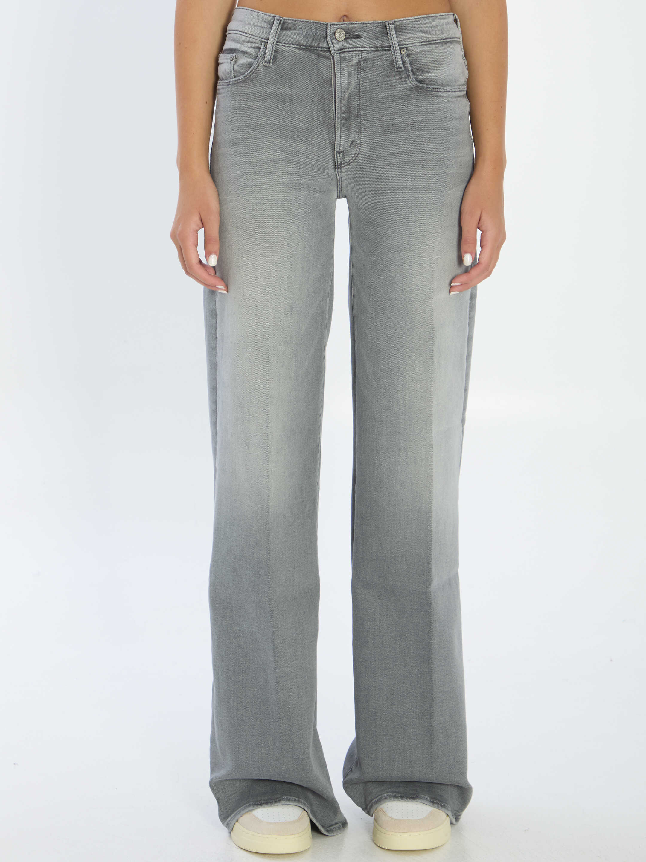 Gray slightly stretchy cotton denim jeans. Mid-rise, wide-leg style. Features five pockets, zip and button closure. Regular fit.