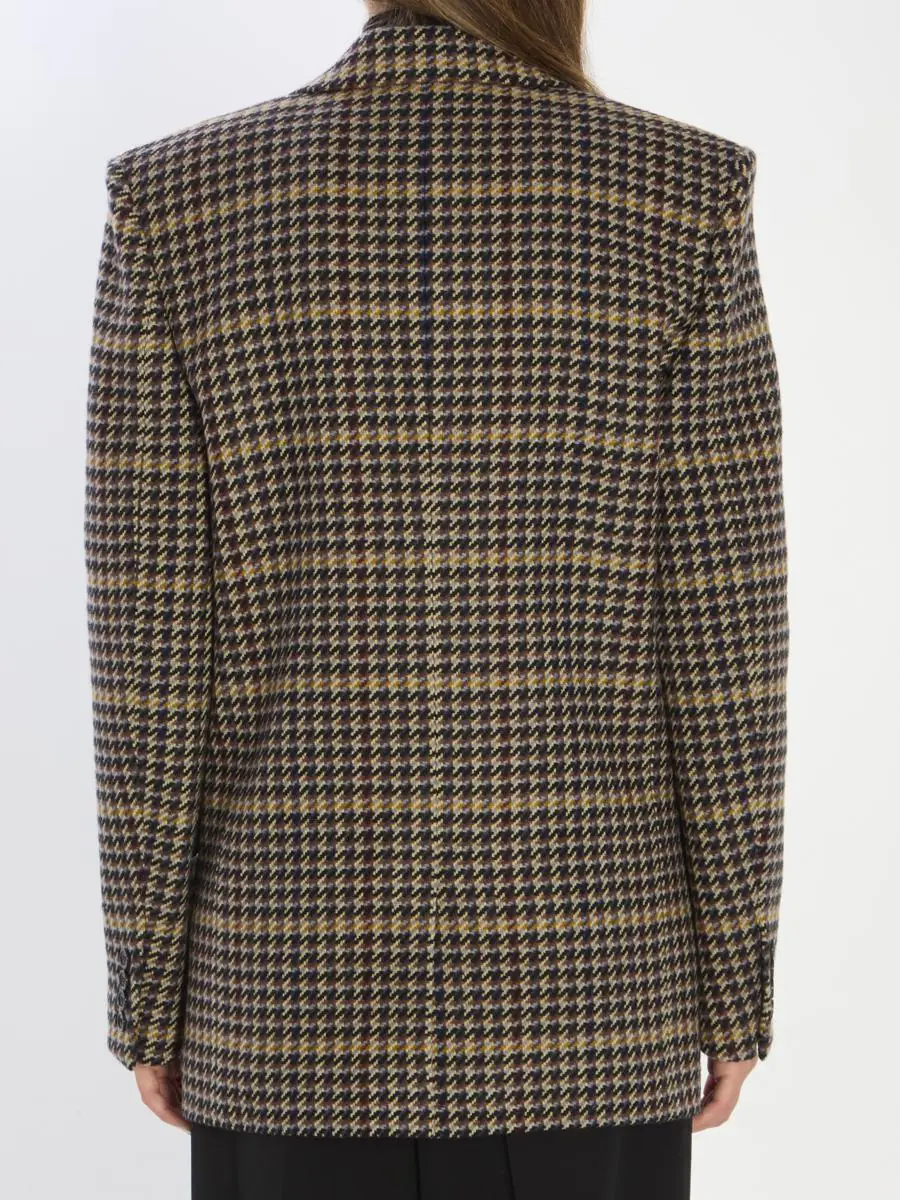 Multicolor checked wool jacket. Features peak lapels, six-button double-breasted closure, two welt flap pockets on the front, one piped chest pocket, four-button cuffs, padded shoulders, and a back vent. Classic fit.