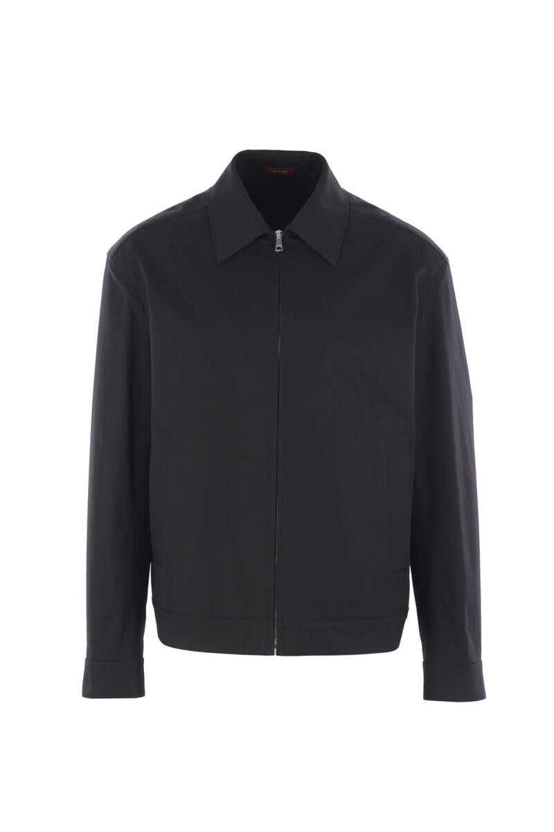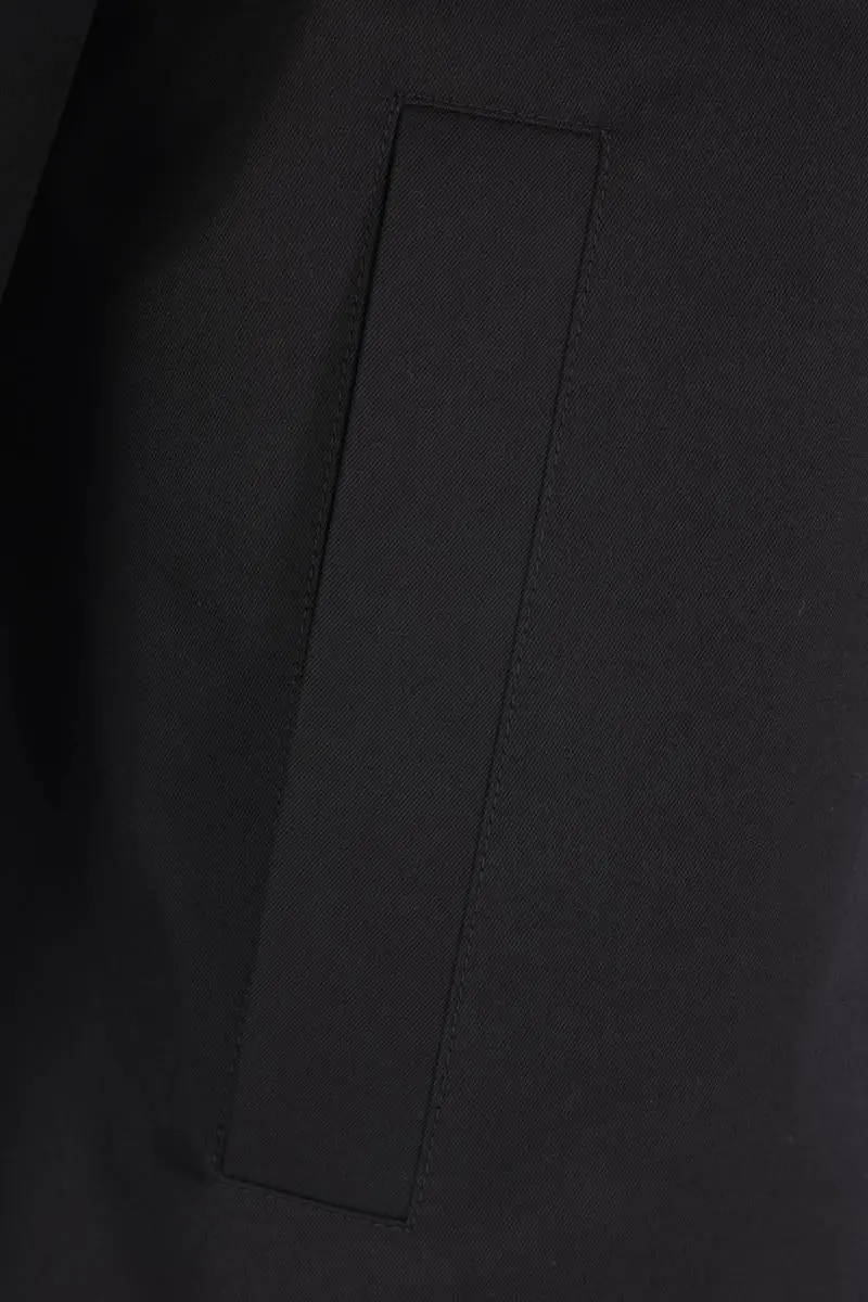 Gucci jacket crafted from black cotton twill with Web detail on the back. Featuring a pointed collar, front zip closure, welt pockets, long sleeves with buttoned cuffs, and a straight hem with adjustable side tabs. Unlined interior.