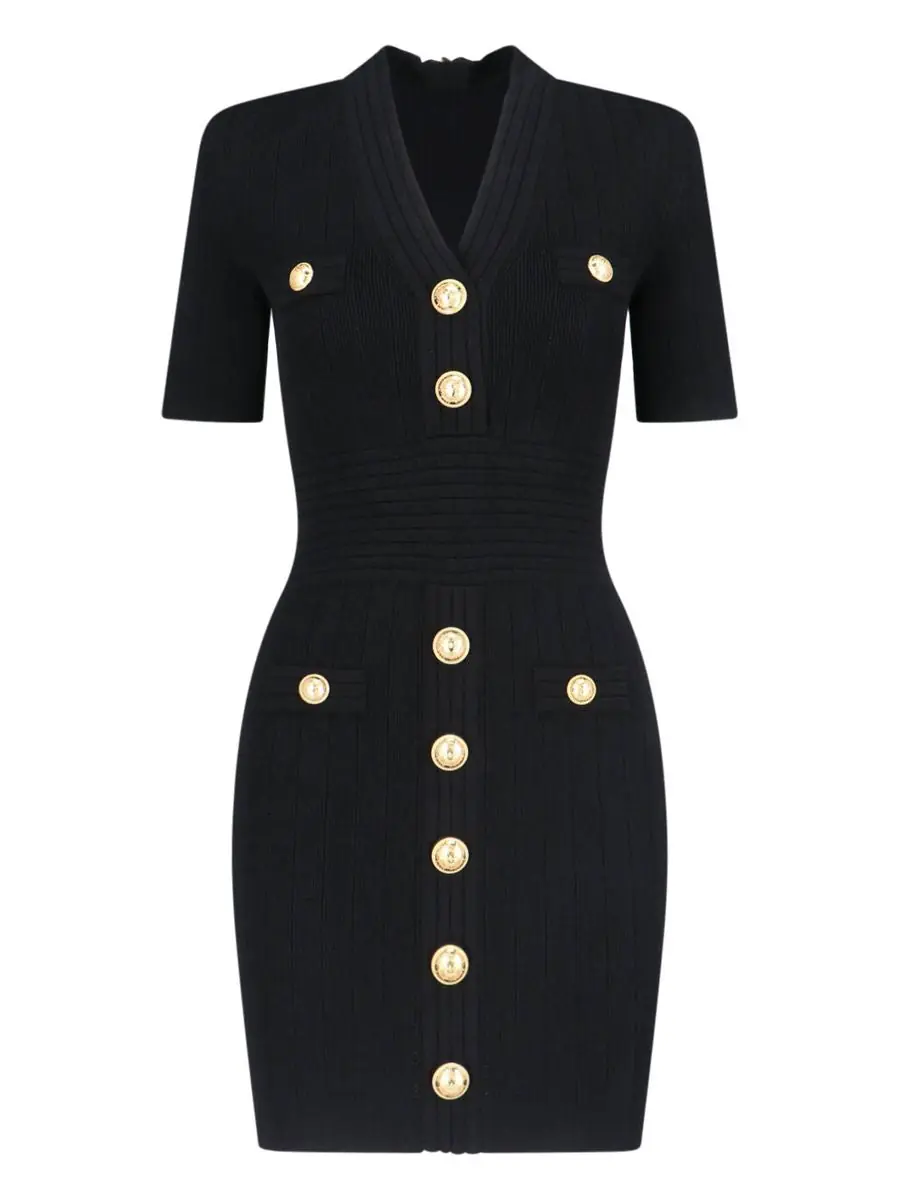 black knitted construction embossed gold-tone buttons ribbed panelling plunging V-neck shoulder pads short sleeves two front pouch pockets straight hem thigh-high