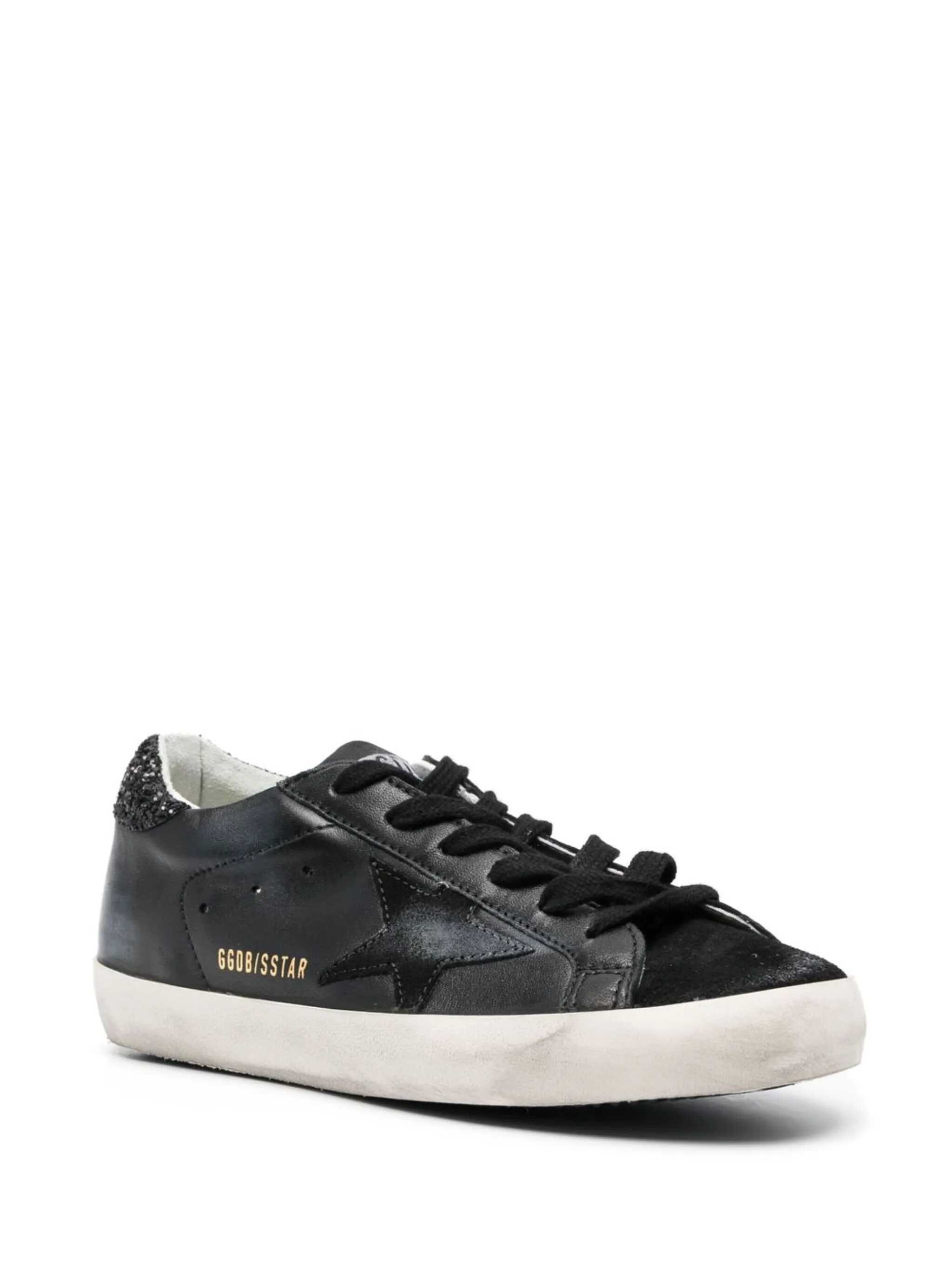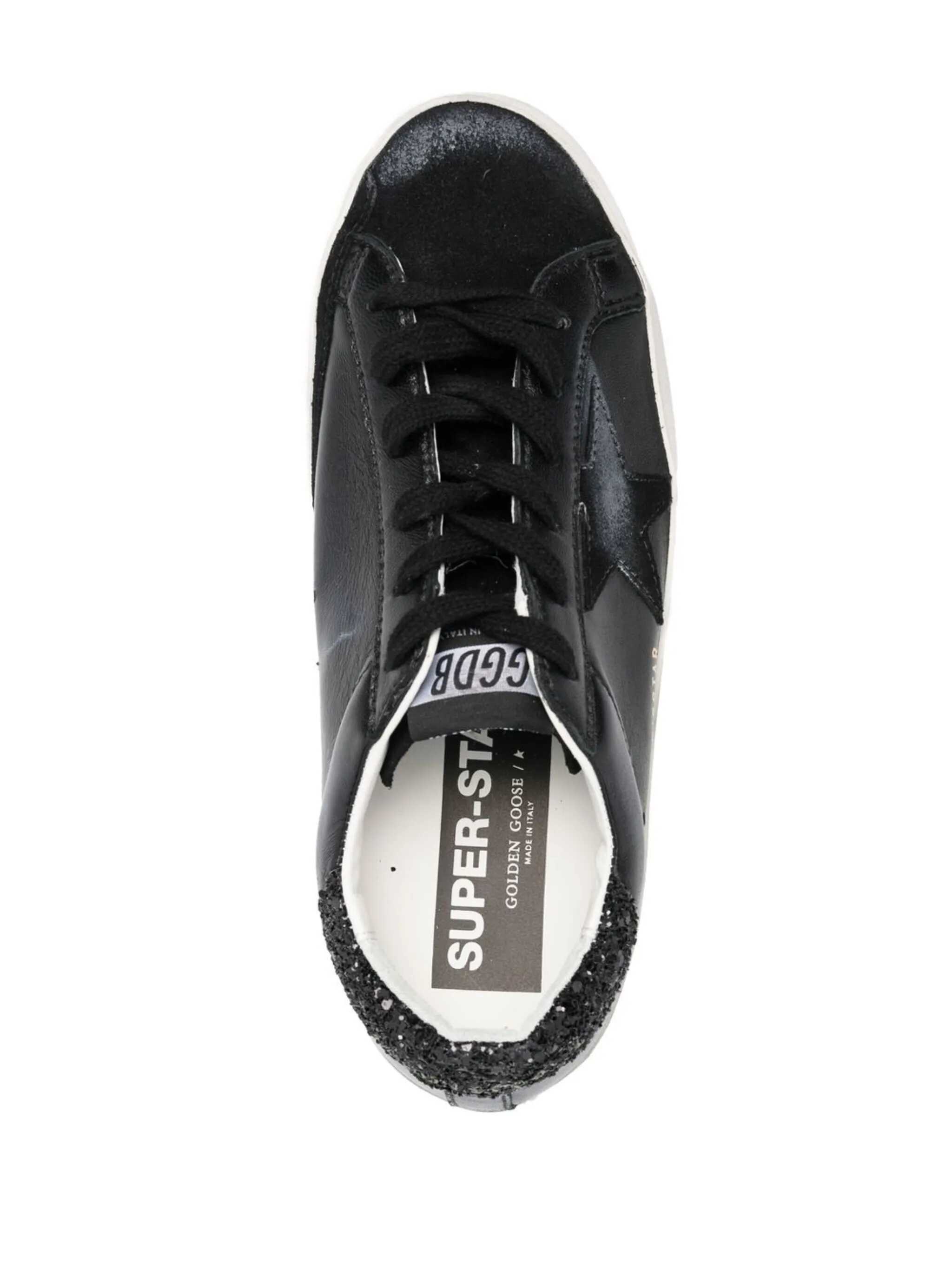 black calf leather signature star patch to the sides logo print to the side glitter detailing front lace-up fastening round toe flat rubber sole
