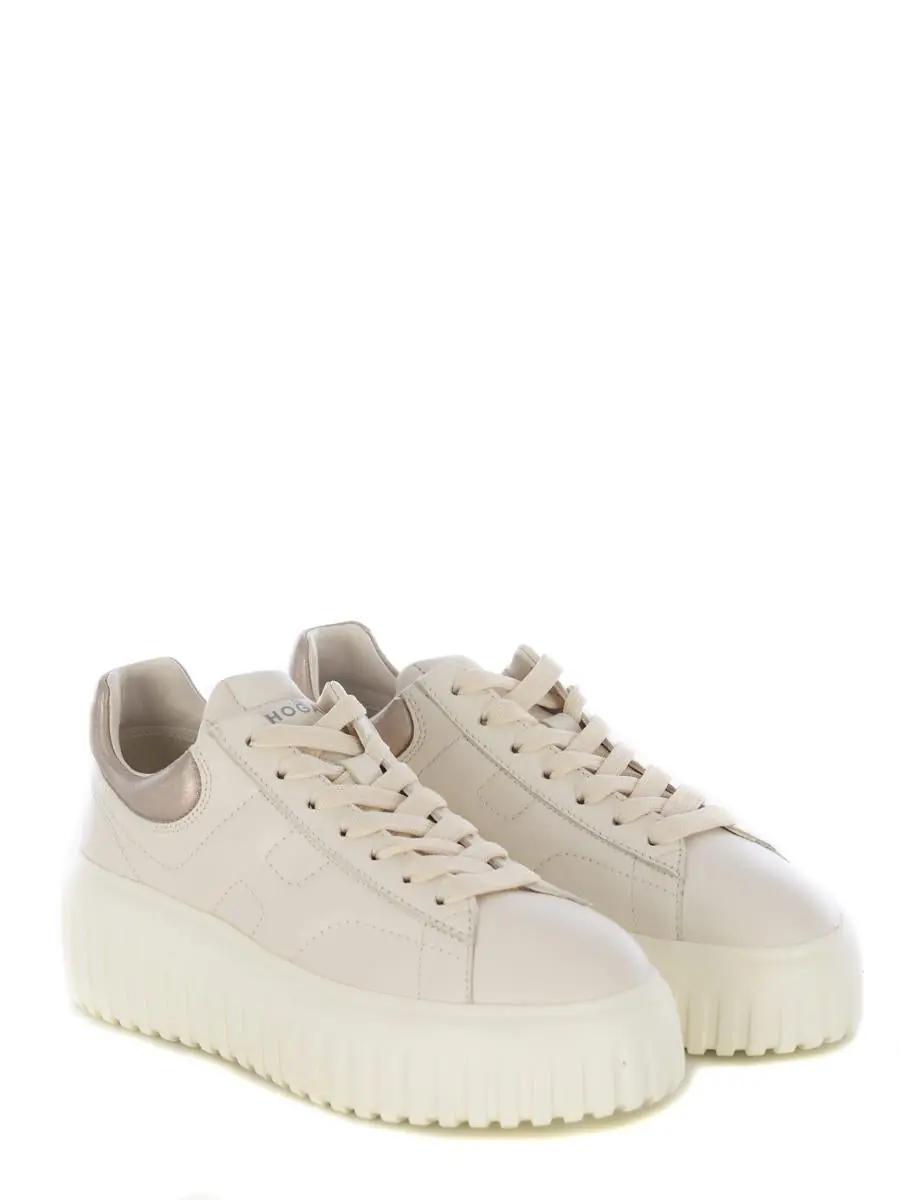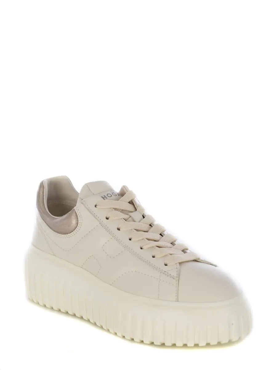 Sneakers Hogan "H-Stripes" made of smooth Cream leather. Round toe. Contrasting Grey logo lettering on the tongue. Lace-up. Tone-on-tone laces. "H" logo on the side. Contrasting Bronze heel on the back. Memory foam lining that ensures cushioning. EVA sole. Extralight sole with vertical stripes. Footbed in 8mm memory foam Total height 5.8cm Sole