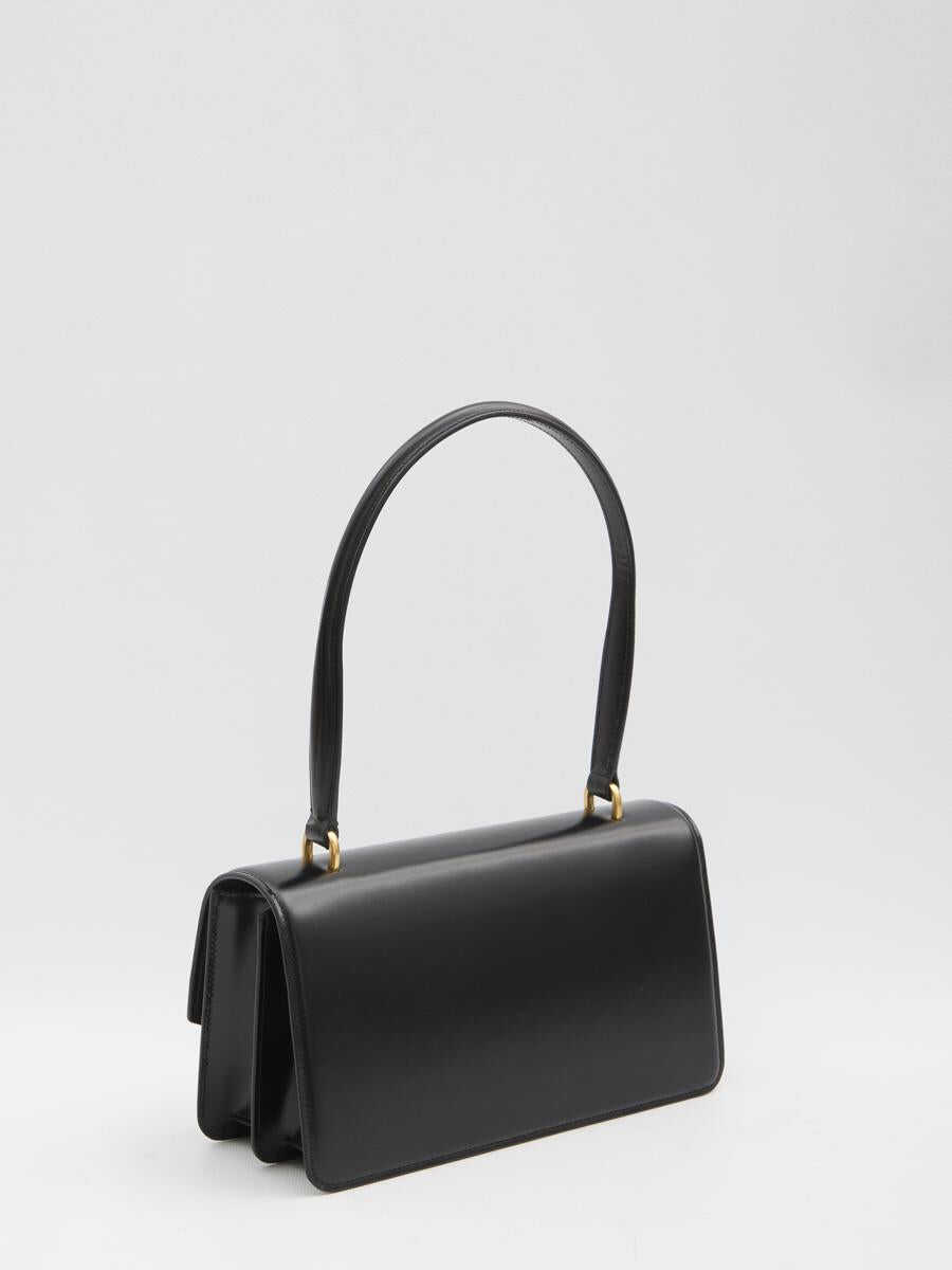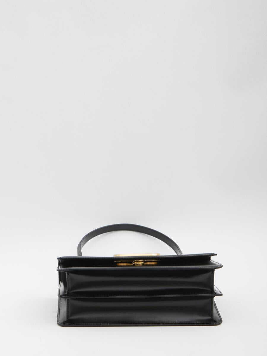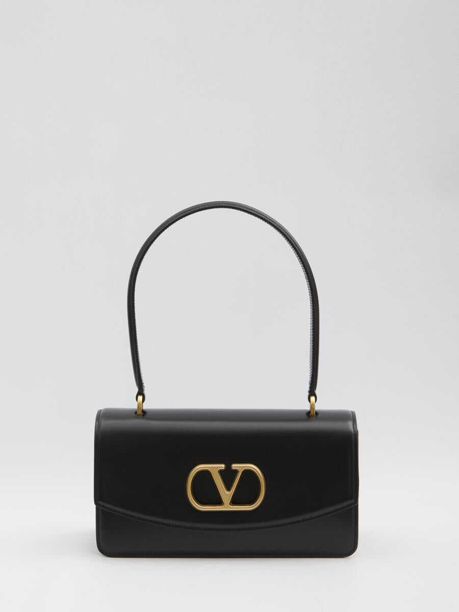 Black glossy calf leather bag. Features a fixed top handle, antique gold-tone metal VLogo, magnetic button closure on the flap, two internal compartments, a zip pocket, and card slots. Dust bag included. Any imperfections in the leather are not to be considered manufacturing defects, but rather a unique characteristic of the material.