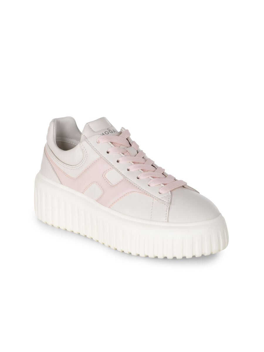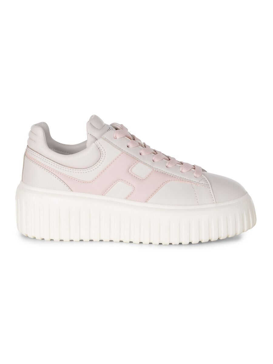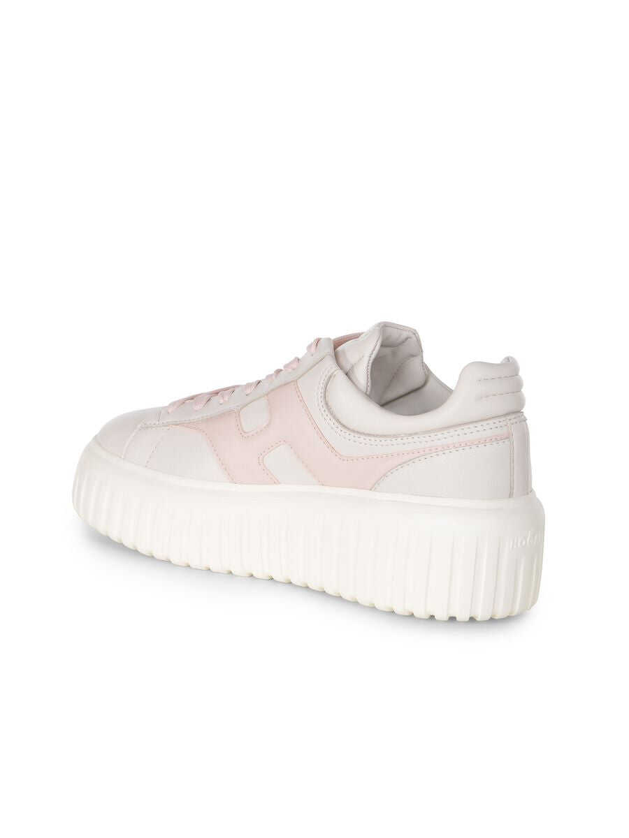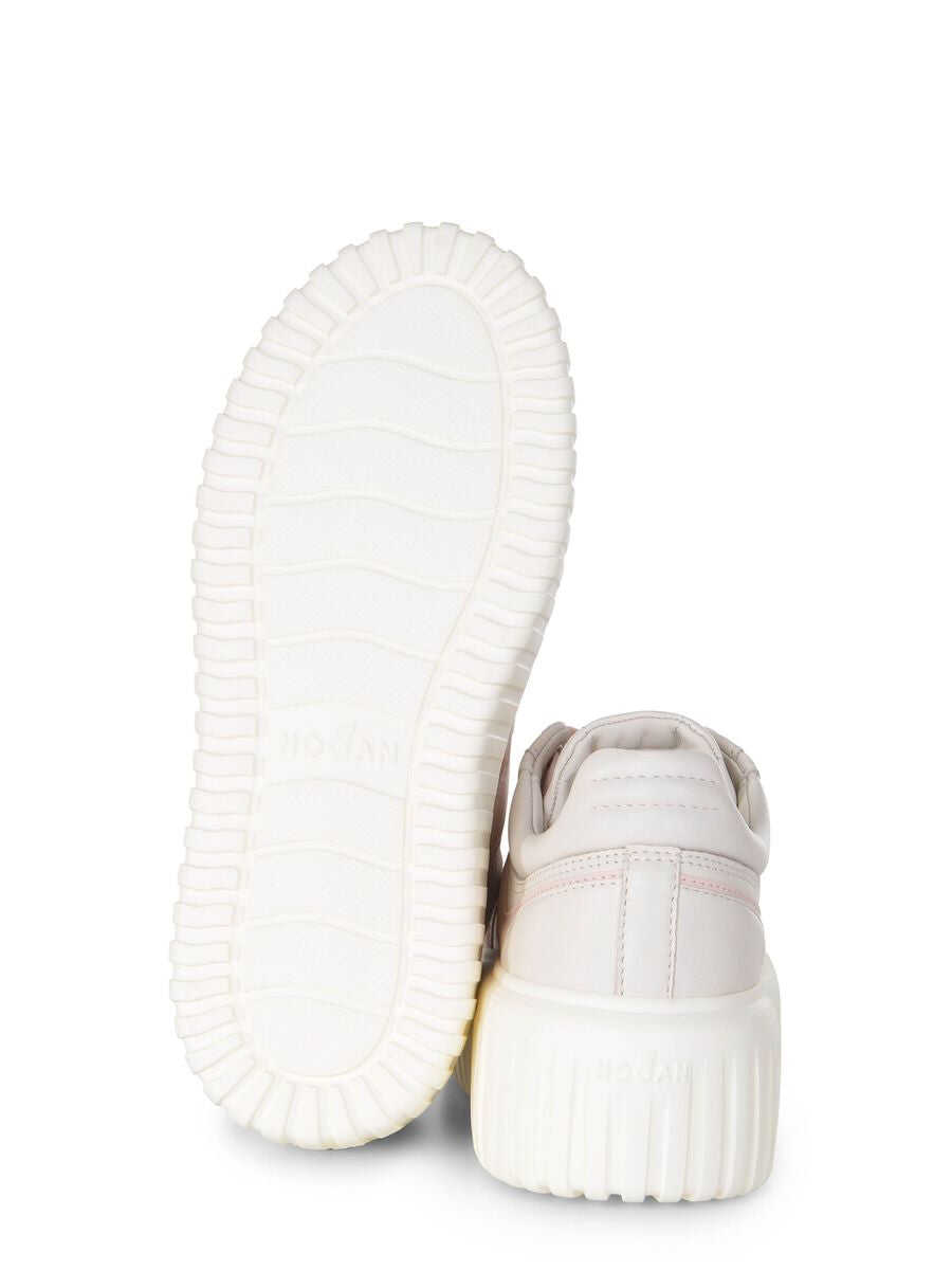 Hogan "H-Stripes" sneakers made of Ivory leather. Lace-up. Contrasting lace in Pink. "H" side in Pink leather. 8 mm memory foam insole 50 mm sole in light rubber with stripes pattern. Total height 5.8 cm