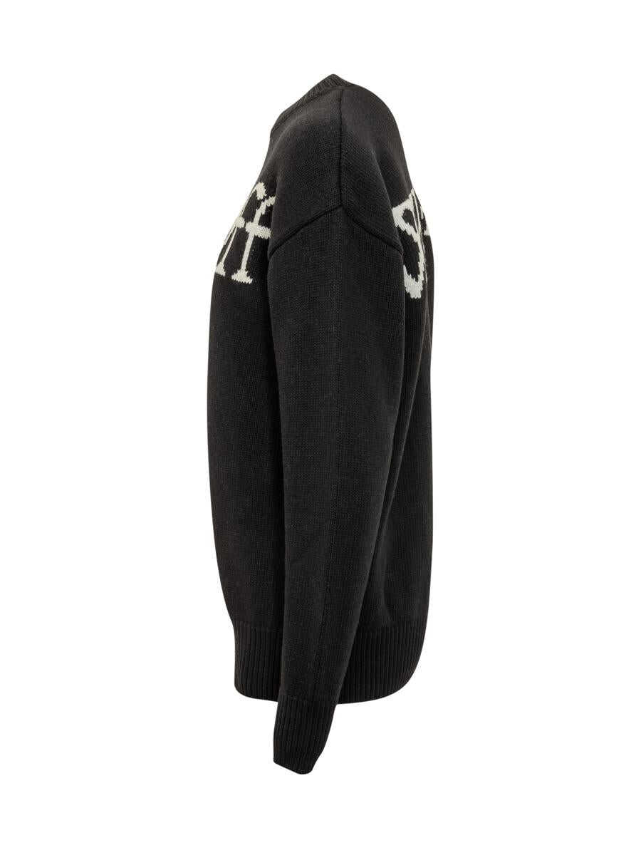 Black wool Off-White sweater with round neck and contrasting inlaid logo on chest.