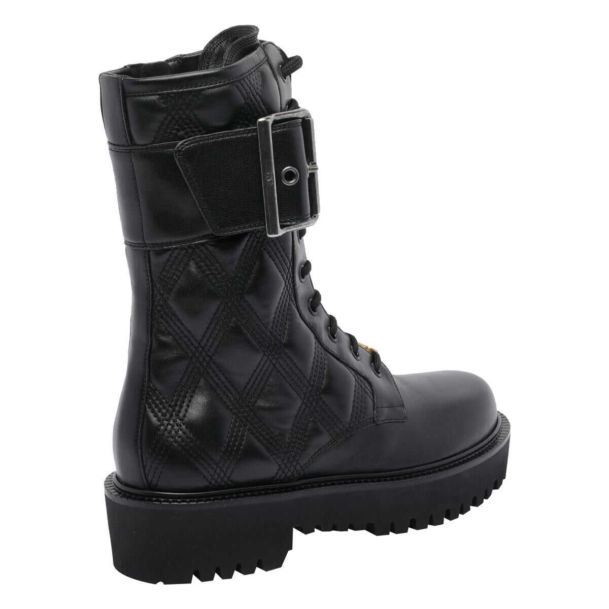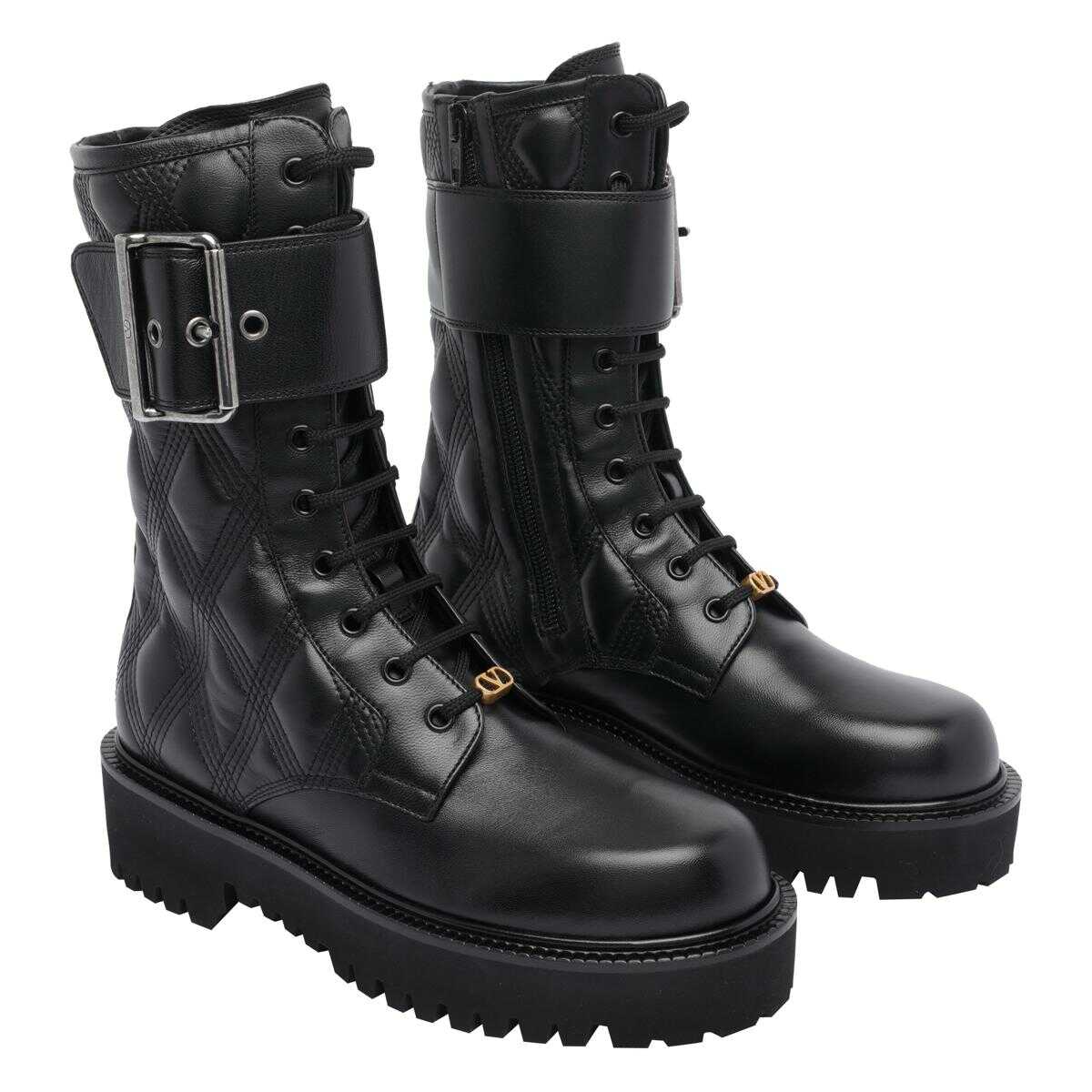 Valentino Garavani Black Valentino Combat Booties, Round Toe, Quilted Model, Lateral Buckle Closure, Leather Upper, Laces Closure, Heel: 6 cm