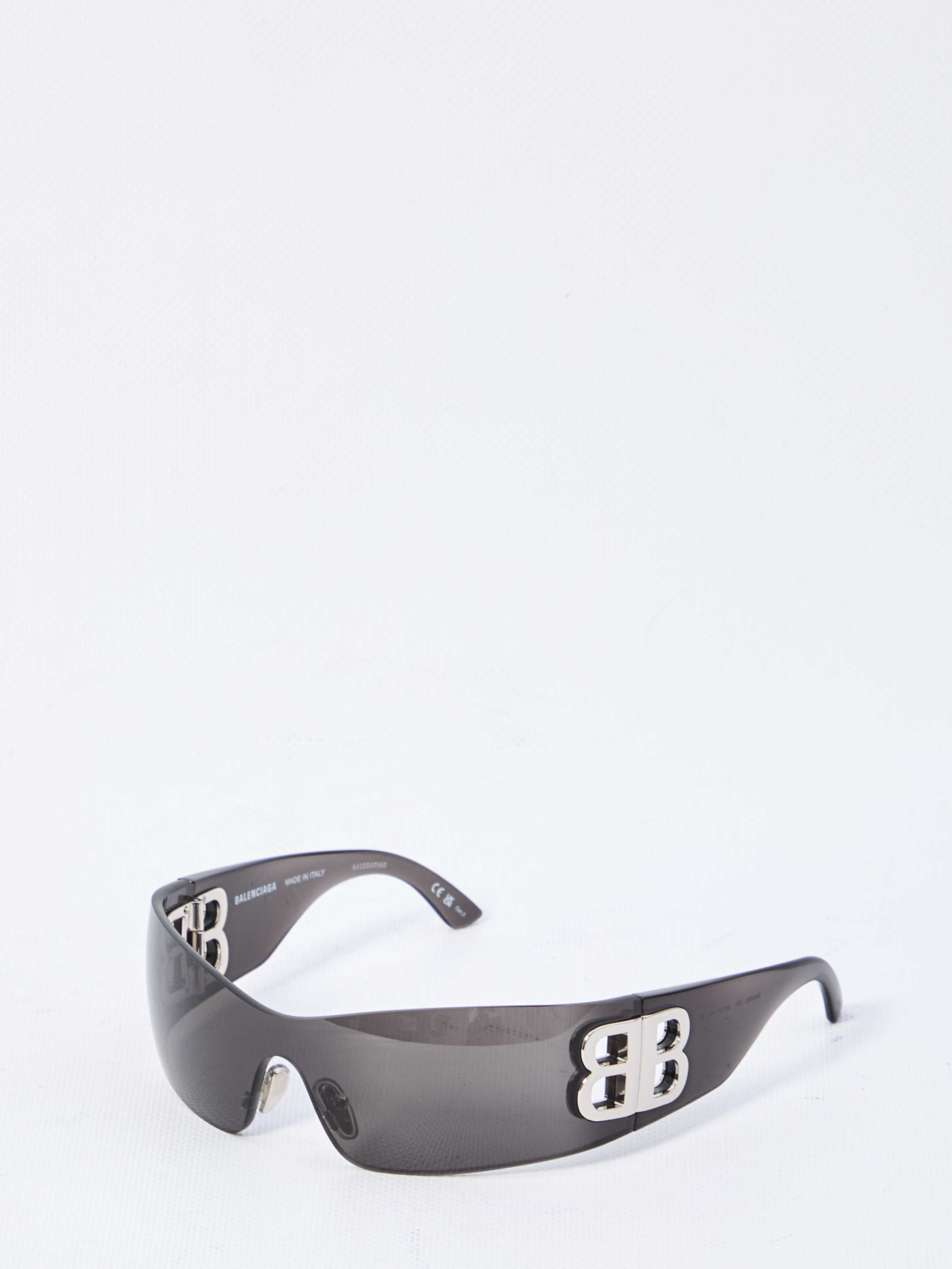 Sunglasses with black injected nylon frame and temples. Feature a mask-style design and silver BB logo on the temples.