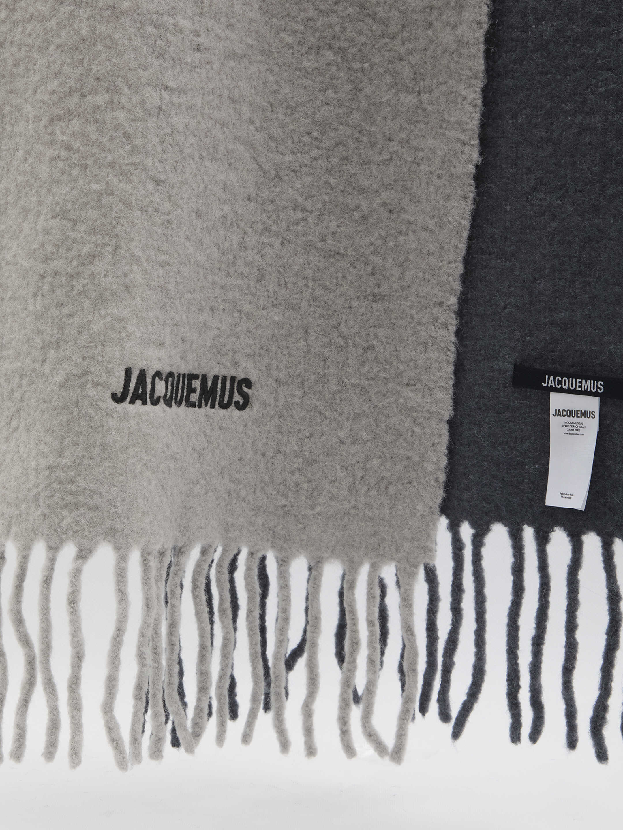 Scarf in alpaca and polyamide with a gradient effect in gray and blue. Features a contrasting embroidered logo and fringes on both ends. Hand-dyed scarf.