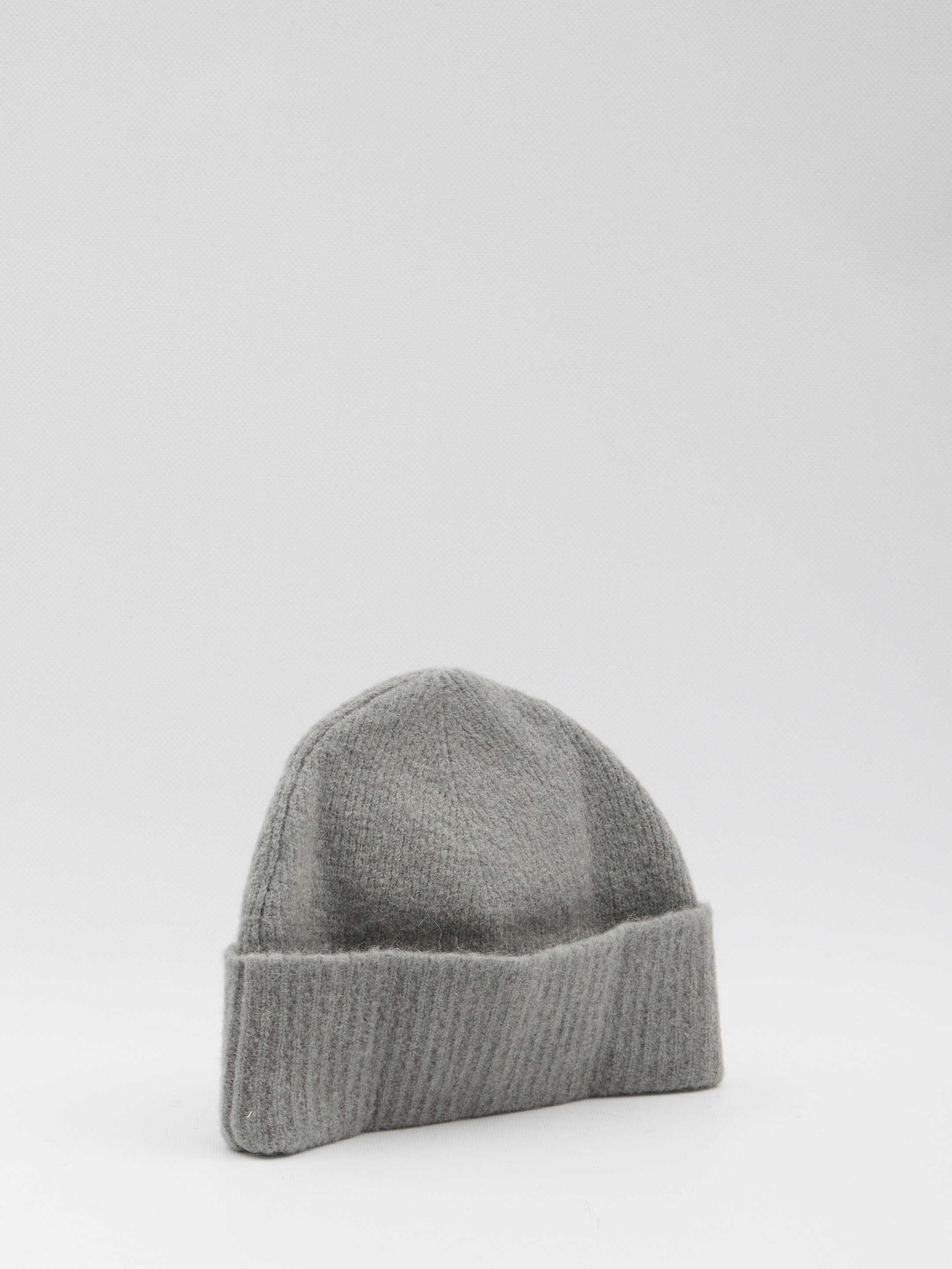 Knitted beanie in alpaca, wool, and polyester in grey, with white Ami de Coeur embroidery on the front.