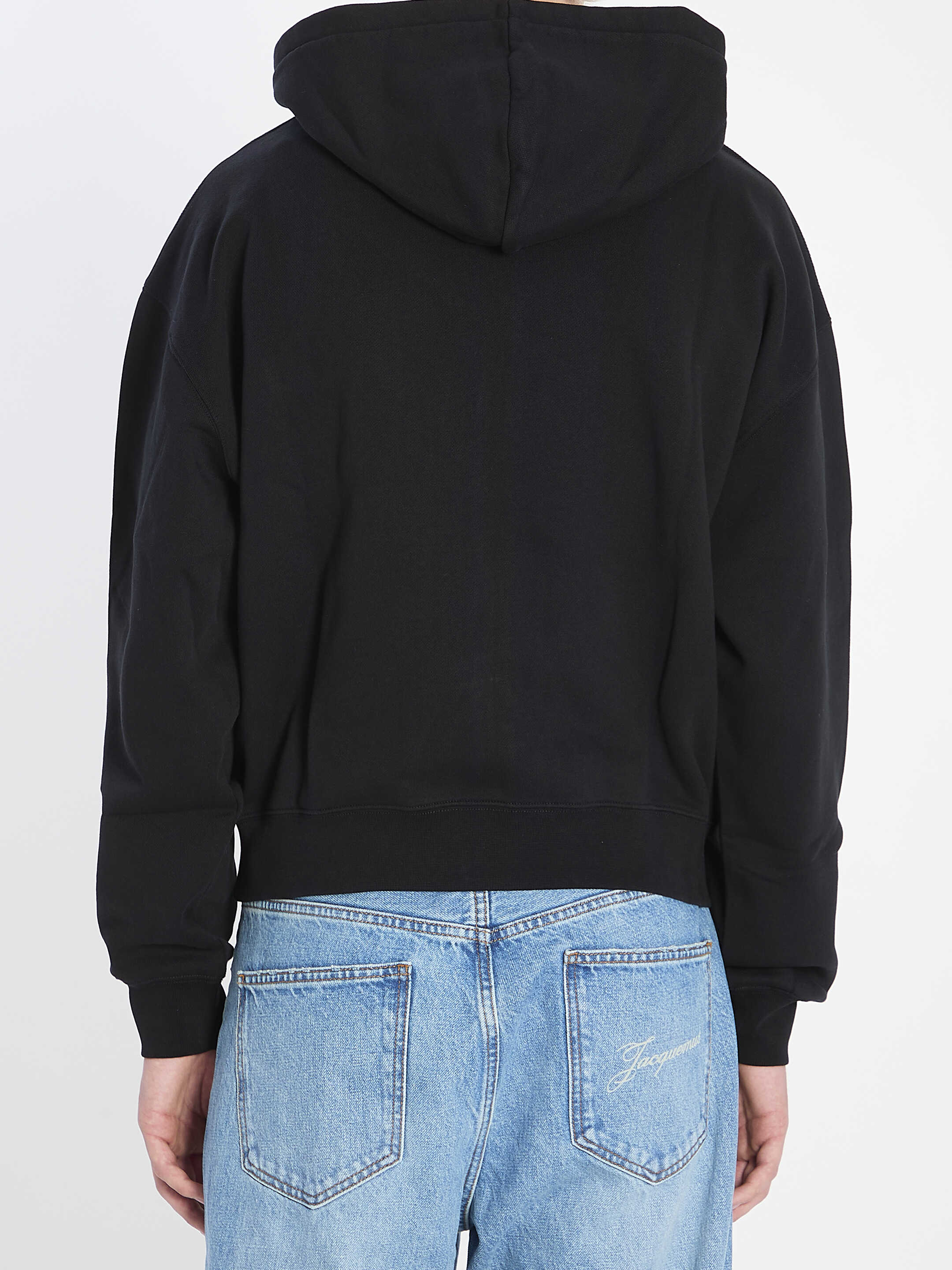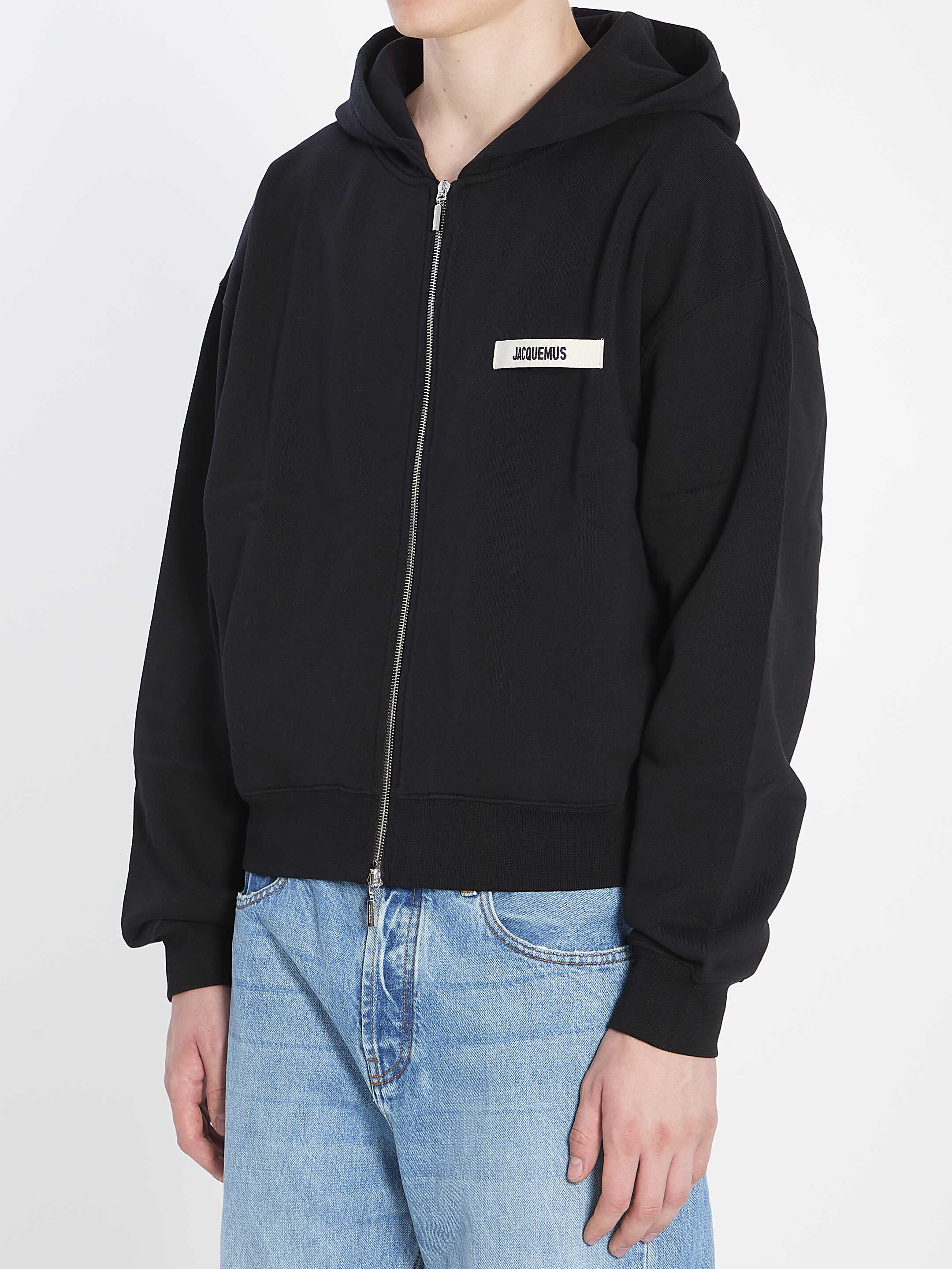 Hoodie in black cotton fleece. Features front closure with double-slider zip—one round and one square with Jacquemus signature, grosgrain embroidered logo on the chest, ribbed hem and cuffs. Regular fit.