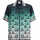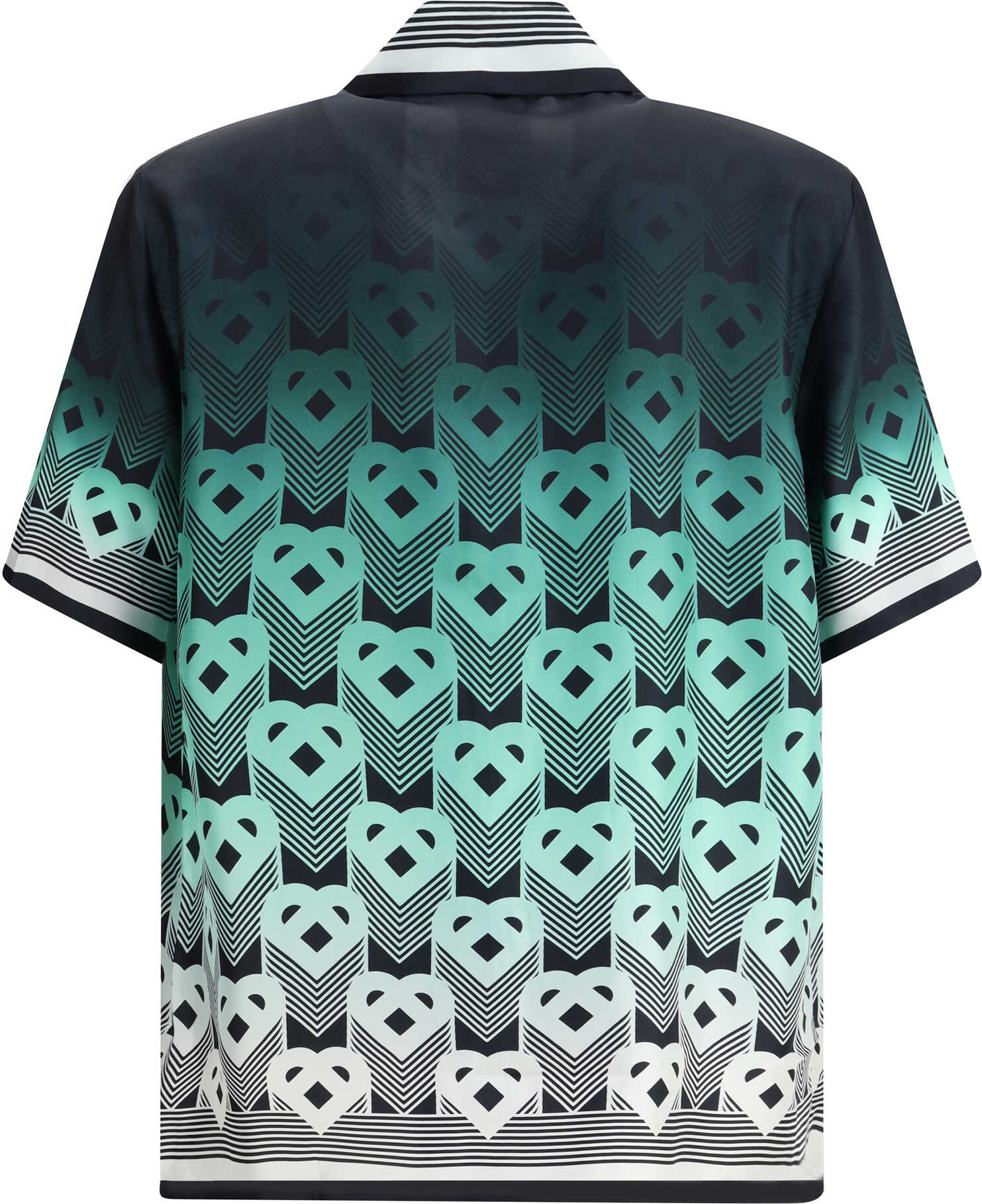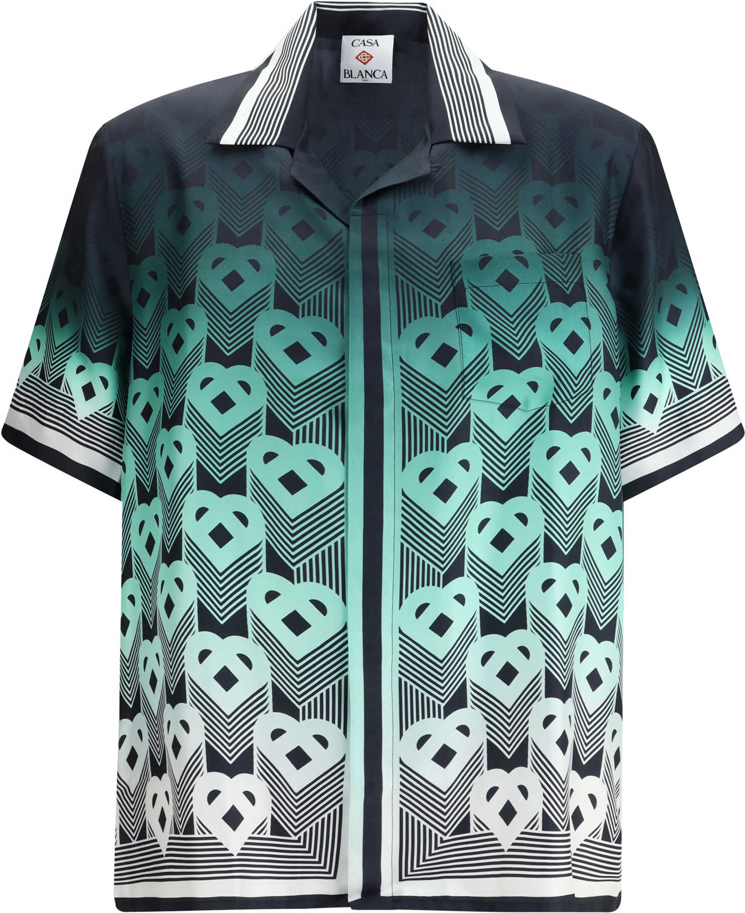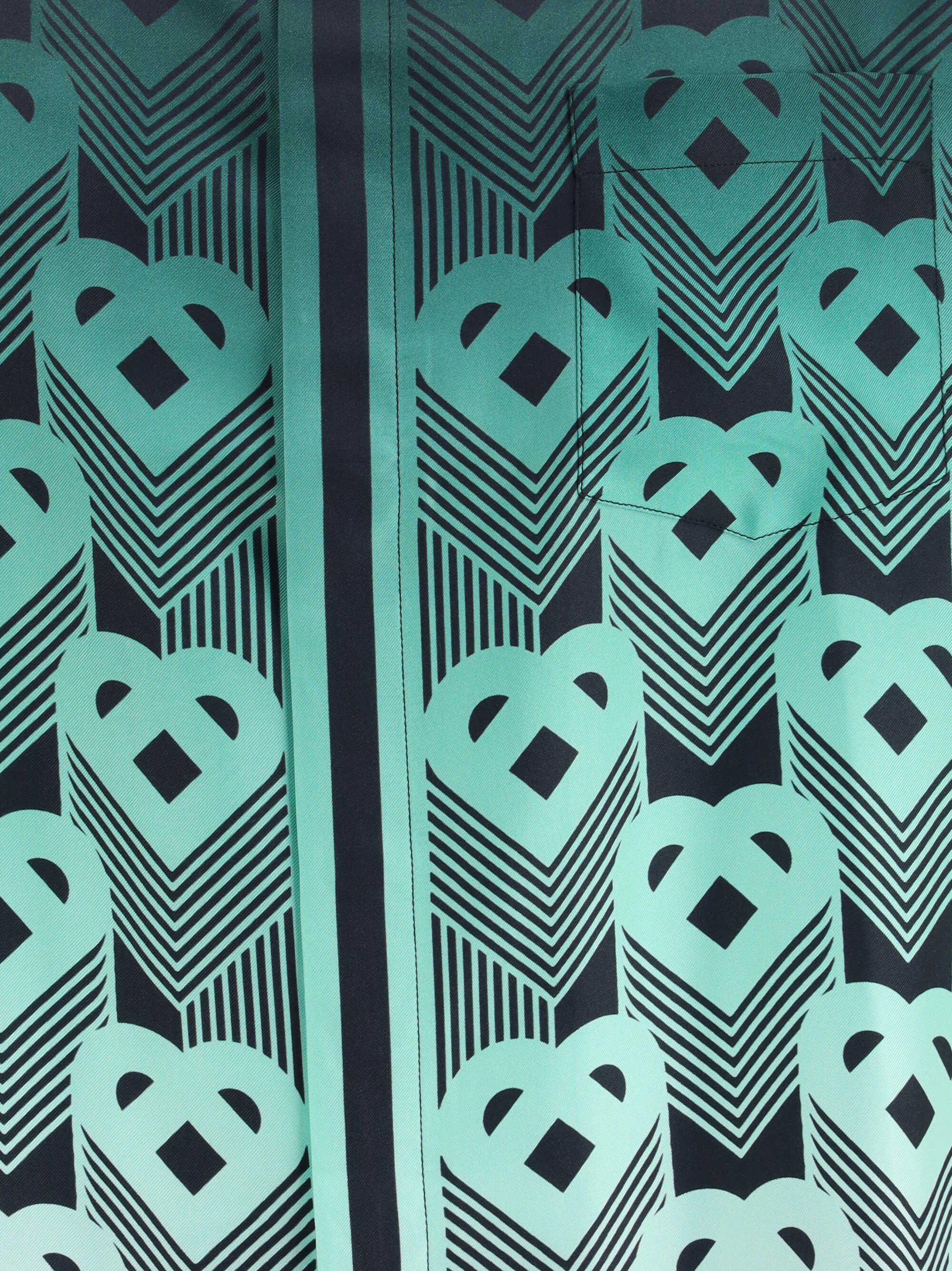Casablanca's Gradient Monogram short sleeve silk Shirt is a sophisticated garment that combines graphic elegance with international inspiration. The all-over print features the house's iconic heart monogram on a delicate mint hue, inspired by the palette of Tokyo's famous Park Hyatt, known for its interiors in shades of mint and black. Made of silk twill with monogrammed workmanship, it features a Cuban collar, an applique breast pocket, concealed button closure and corozo buttons with CC woven logo. Striped piping on the collar, cuffs, placket and hem complete the design, adding a distinctive graphic touch.