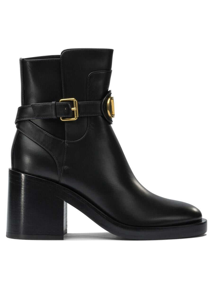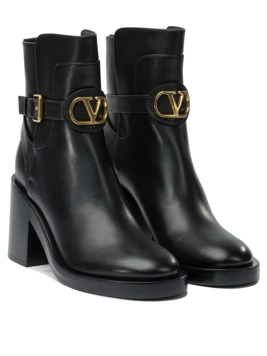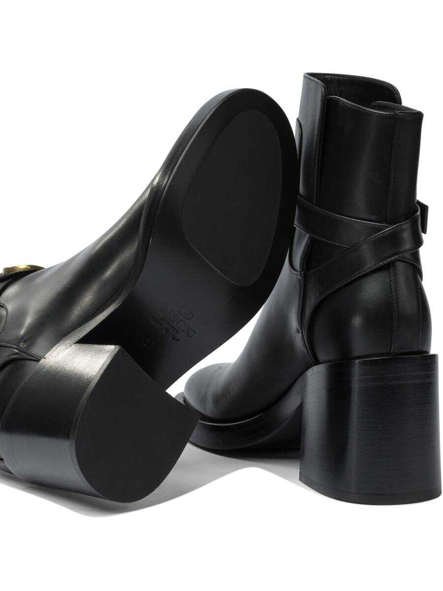 Valentino Garavani 70 mm "VLogo Signature" ankle boots with calfskin leather upper. Molded structure with tapered silhouette and sturdy sole. Leather patch is applied on the front with brass logo. Side closure with adjustable strap and metal buckle. Paneled construction with visible stitching and low profile at the malleolus. Silhouette defined by slightly contoured edge.