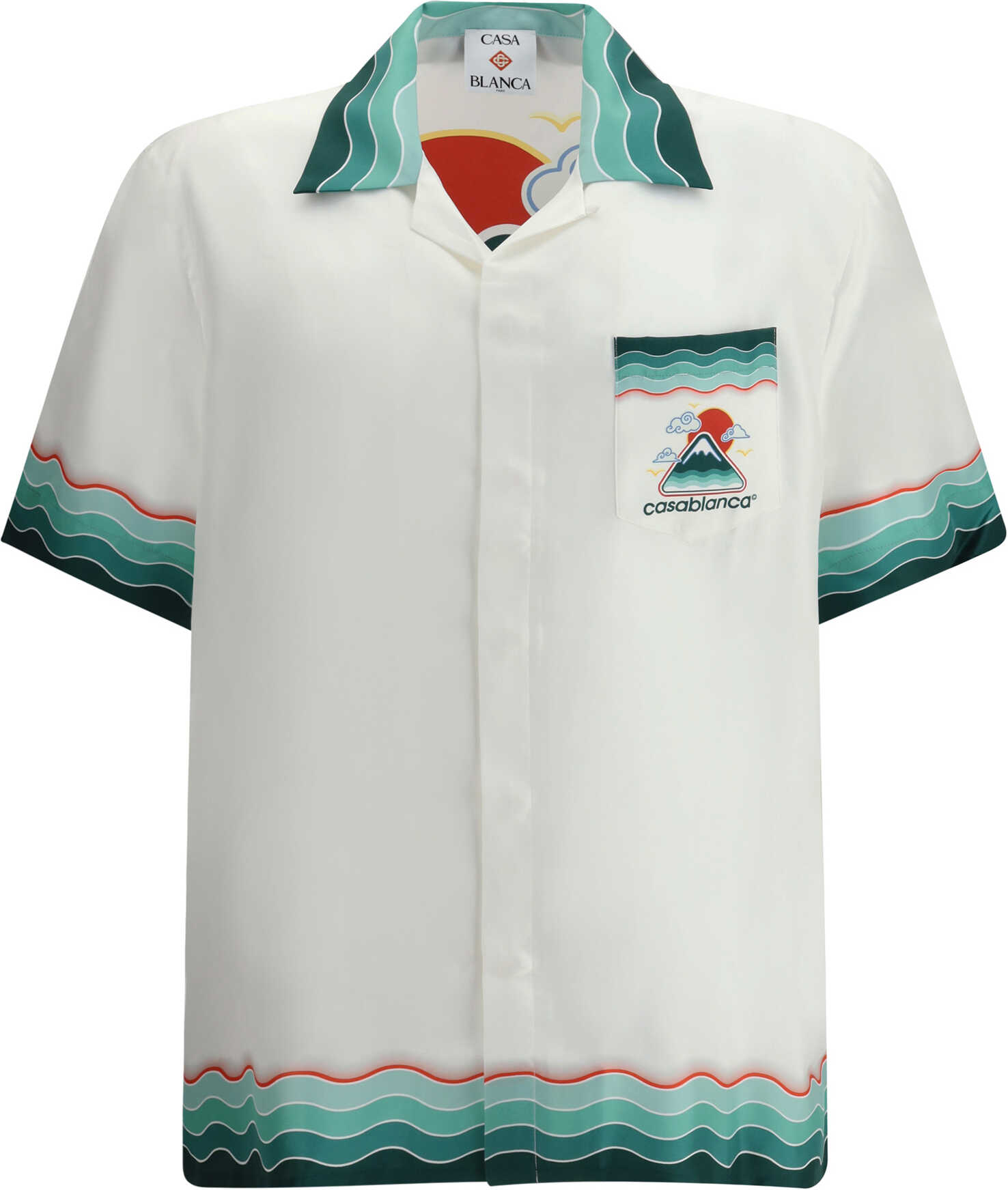 The Montagne Ondulée Shirt is an iconic short-sleeved garment made of fine printed silk twill. The all-over print, inspired by traditional Japanese iconography, interprets a refined, contemporary aesthetic with essential lines and bold colors. The Cuban collar and front closure with concealed buttons lend casual elegance, while corozo buttons with CC woven logo add a touch of exclusivity. Memphis wave-patterned piping on the collar, cuffs and hem complete the design, lending a distinctive and sophisticated graphic accent.