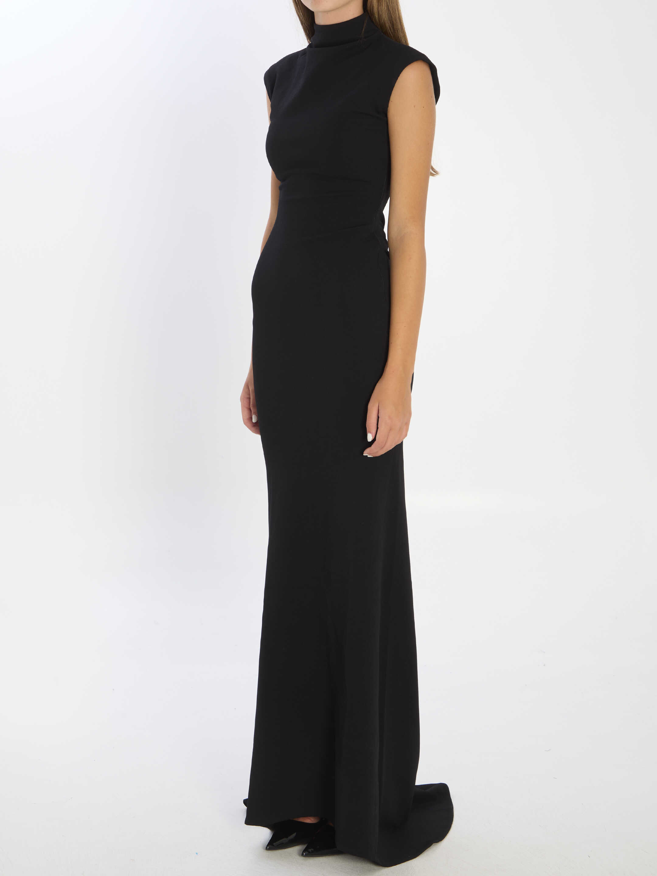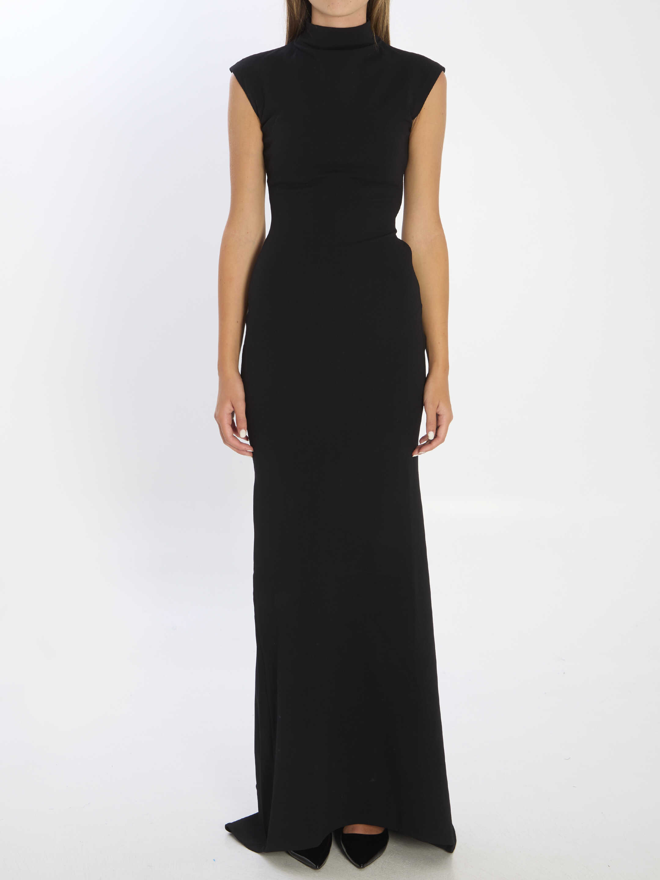 Column dress in compact stretch viscose jersey crepe in black. Features a long, contoured cut, integrated mock neck, cap sleeves, invisible zippers at the back and side, gathered detailing on the back, and a floor-length hem with a small train. Regular fit.