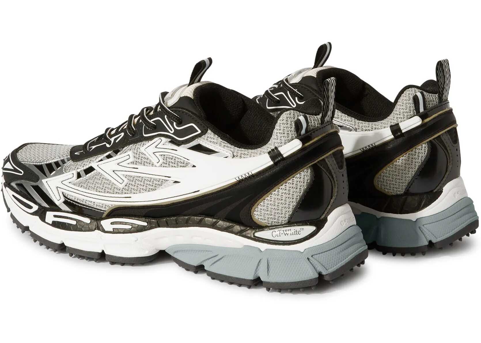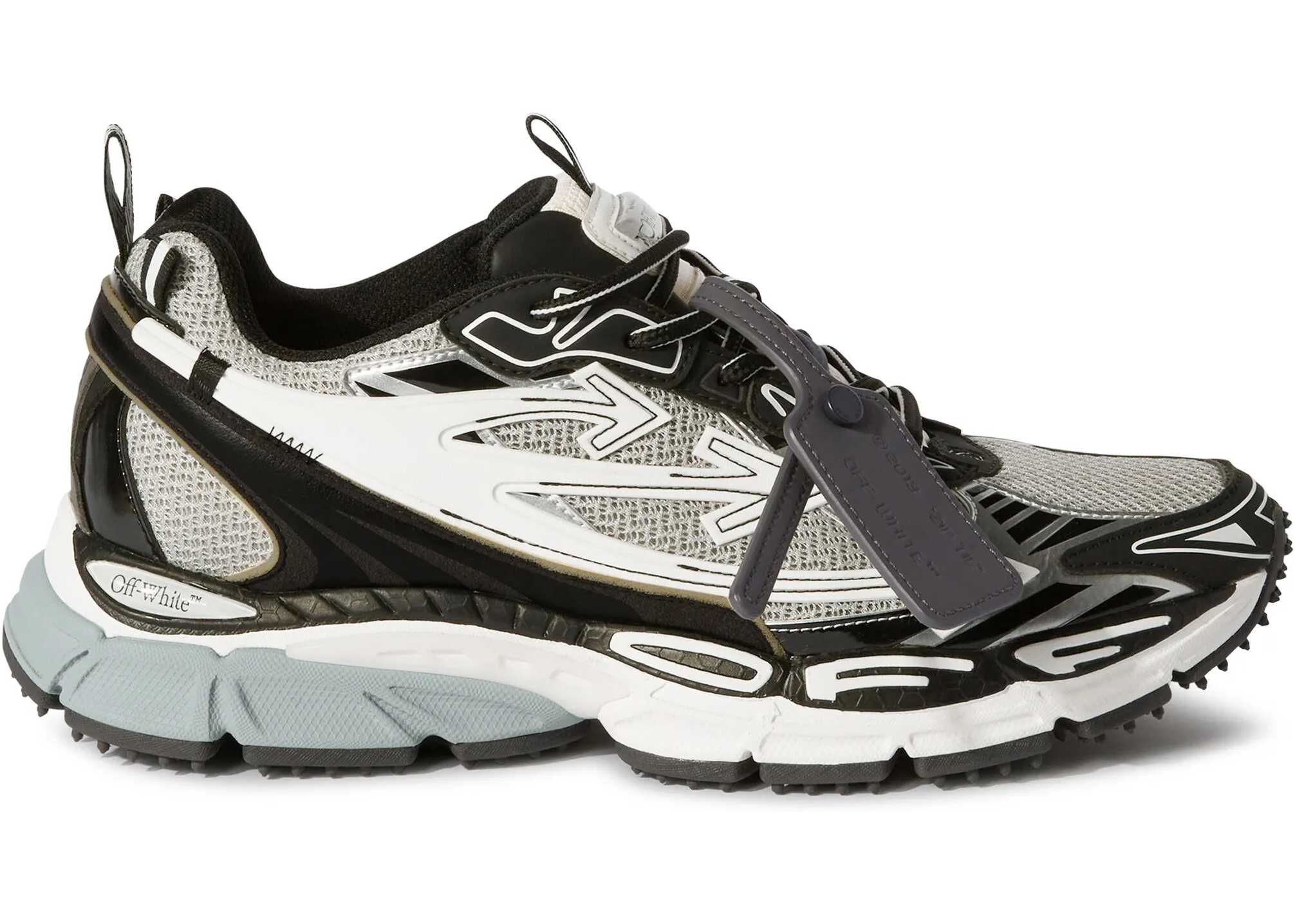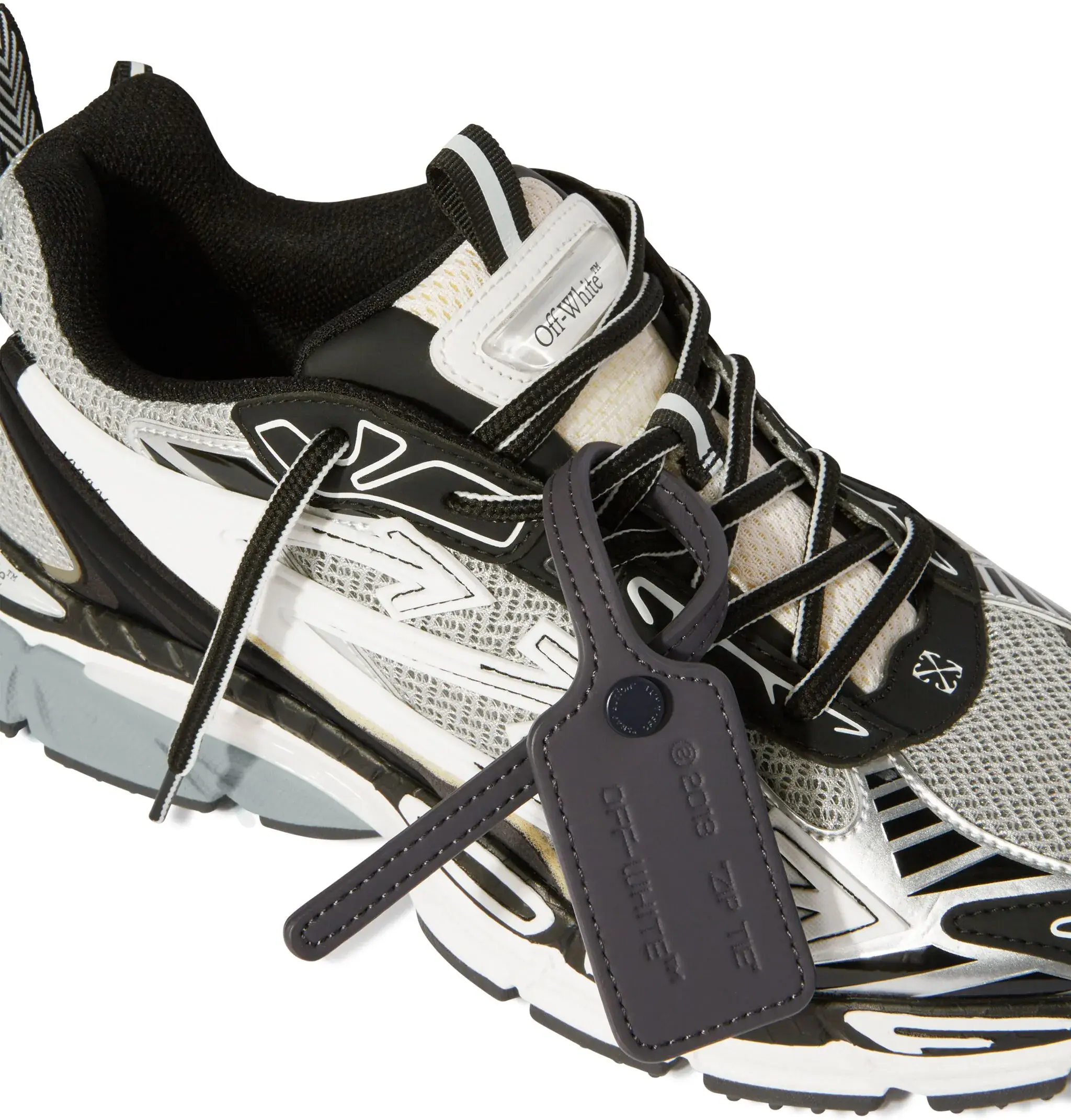 The Off-White Be Right Back Sneakers combine mesh and rubberized leather for a modern and resistant look. The iconic zip tie on the front and the monogram printed on the tongue and insole recall the distinctive design of the brand. The closure is with laces, for an adjustable fit. The shoe has a tapered silhouette, perfect for a bold and contemporary streetwear style.