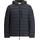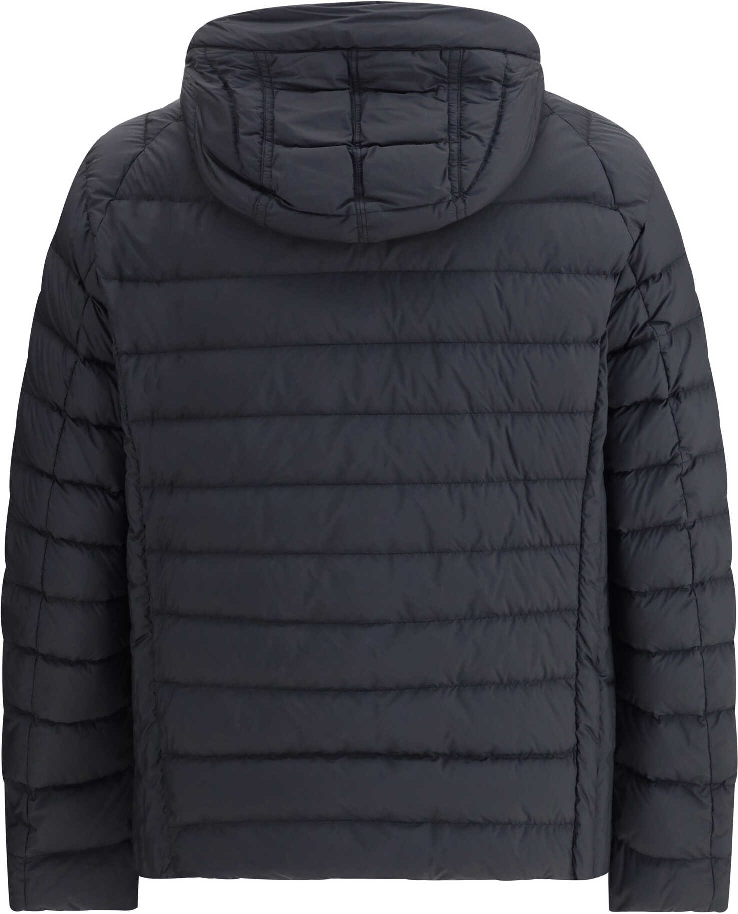 Parajumpers' Last Minute hooded Down Jacket, treated with a water-repellent finish, is designed for comfort and protection. Featuring an adjustable hood with drawstring and front closure with a double-slider zipper, it offers three exterior zippered pockets and an interior pocket with Velcro closure. It features underarm ventilation, elasticized hem and cuffs and elastic rib inner collar. Completing the design is the Parajumpers patch on the sleeve and the iconic yellow tape at the collar closure.