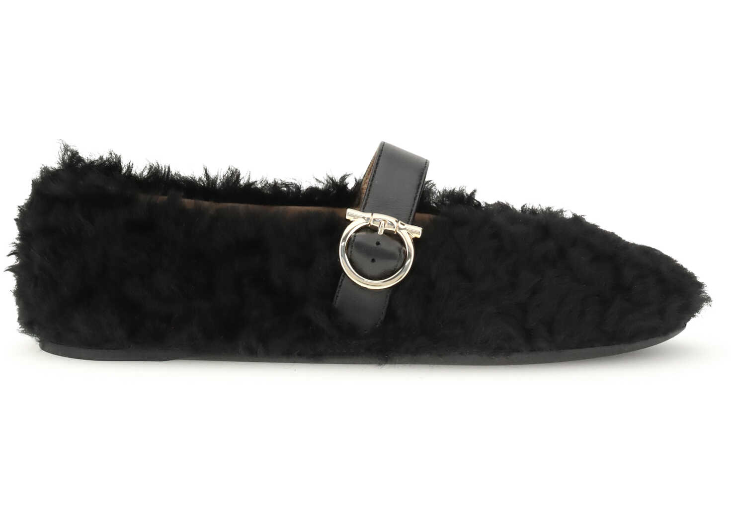 Ferragamo's Gancini-embellished Ballerinas by Ferragamo reinterprets a classic with a playful, contemporary twist. Featuring a contoured neckline and soft silhouette, it is distinguished by a curly shearling lining, ideal for the cold season. The rubber sole maintains the usual flexibility, while the Gancini buckle on the strap adds an iconic and refined detail.