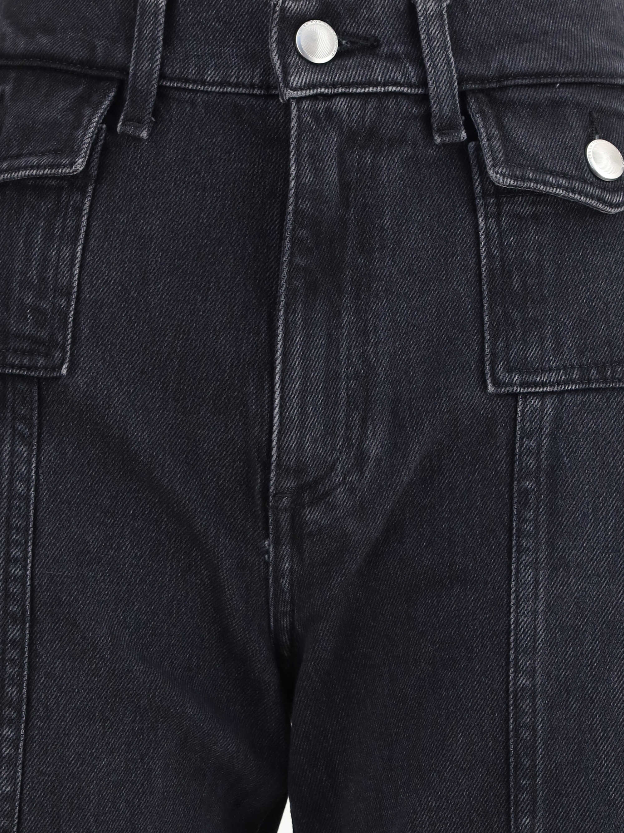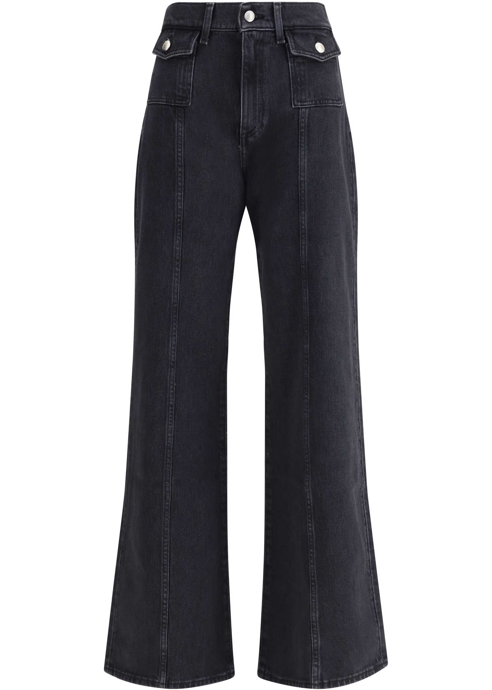 The Lotta wide leg Jeans by 7For feature a high-waisted silhouette that gently hugs the contours of the waist and hips, then opens into a wide, comfortable, full-length leg. The design features a front seam detail that accentuates the structure, while the flap pockets are embellished with elegant gold trim. The closure features a zipper and button, and the back pocket maintains a clean, minimalist design for a modern, sophisticated look.