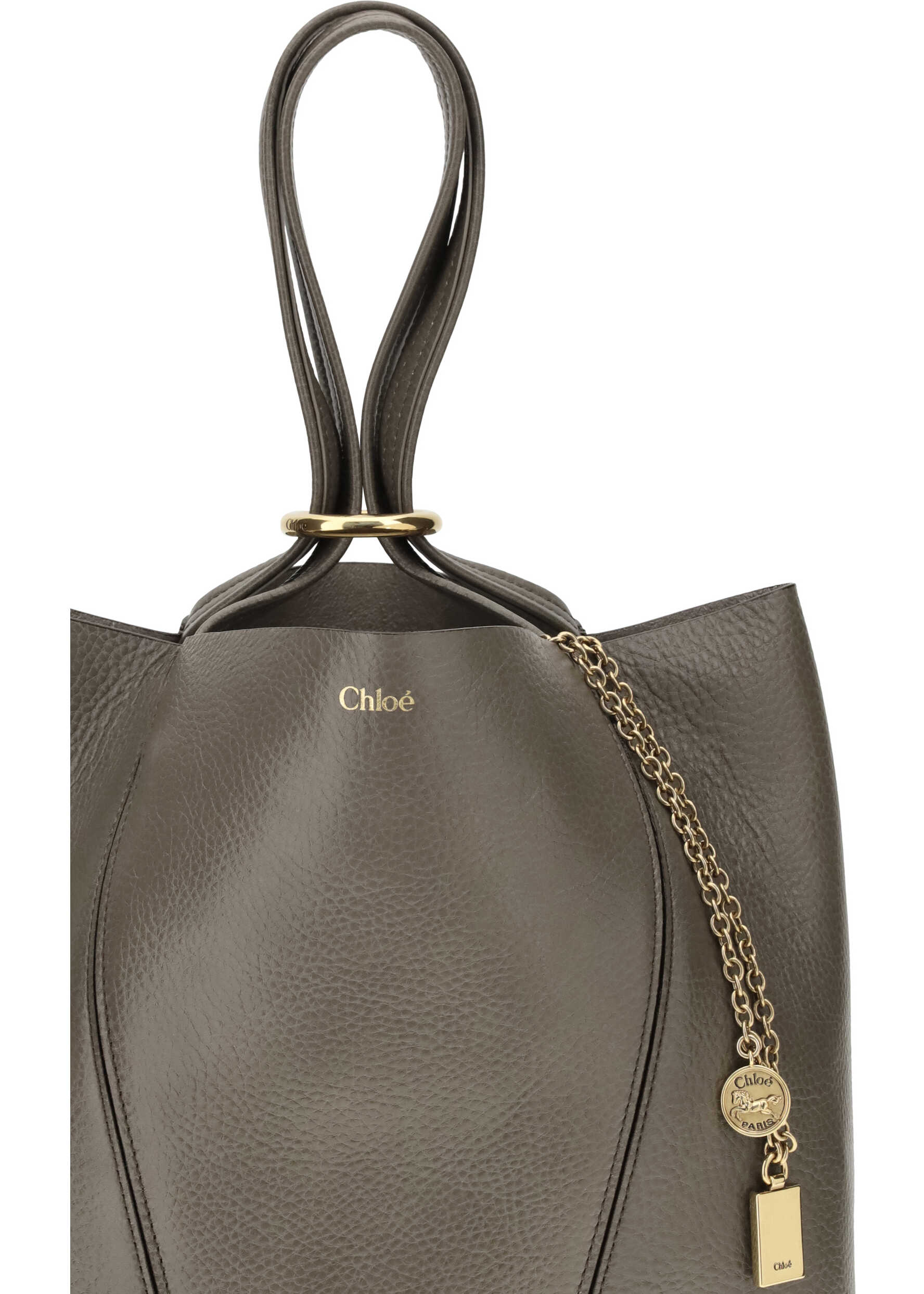 Leather Spin Shoulder Bag by Chloé is a refined and modern accessory featuring a sleek grained leather design. The two flat top handles offer a comfortable and practical grip, while the brand's iconic monogram, press-stamped on the front, adds a distinctive touch of luxury. The closure of the bag is made via a ring that holds the two handles together, an element that gives it a unique and functional look. A fascinating detail is the chain with a pendant bearing the iconic logo applied to the handle. The interior of the bag consists of a single compartment.