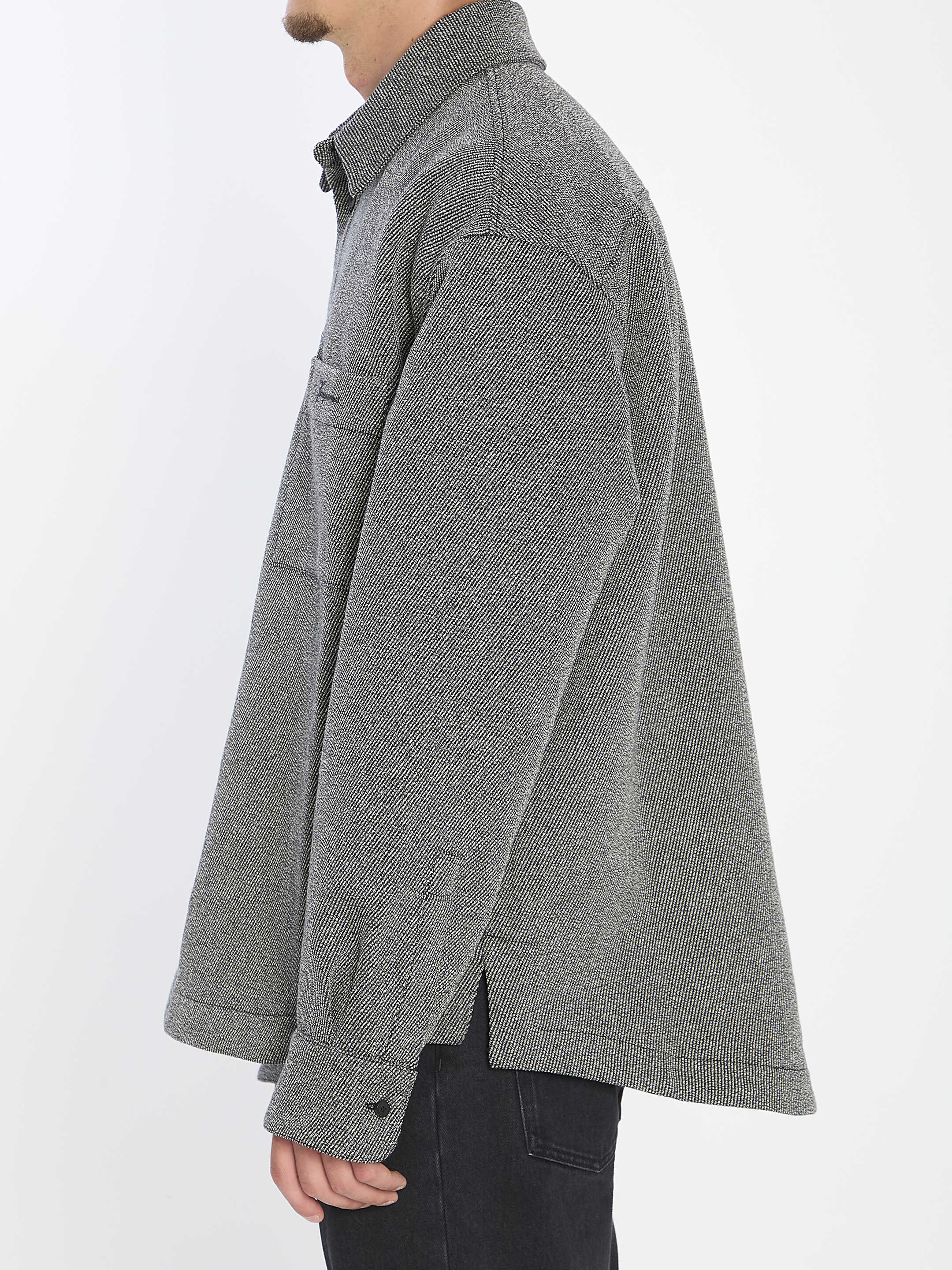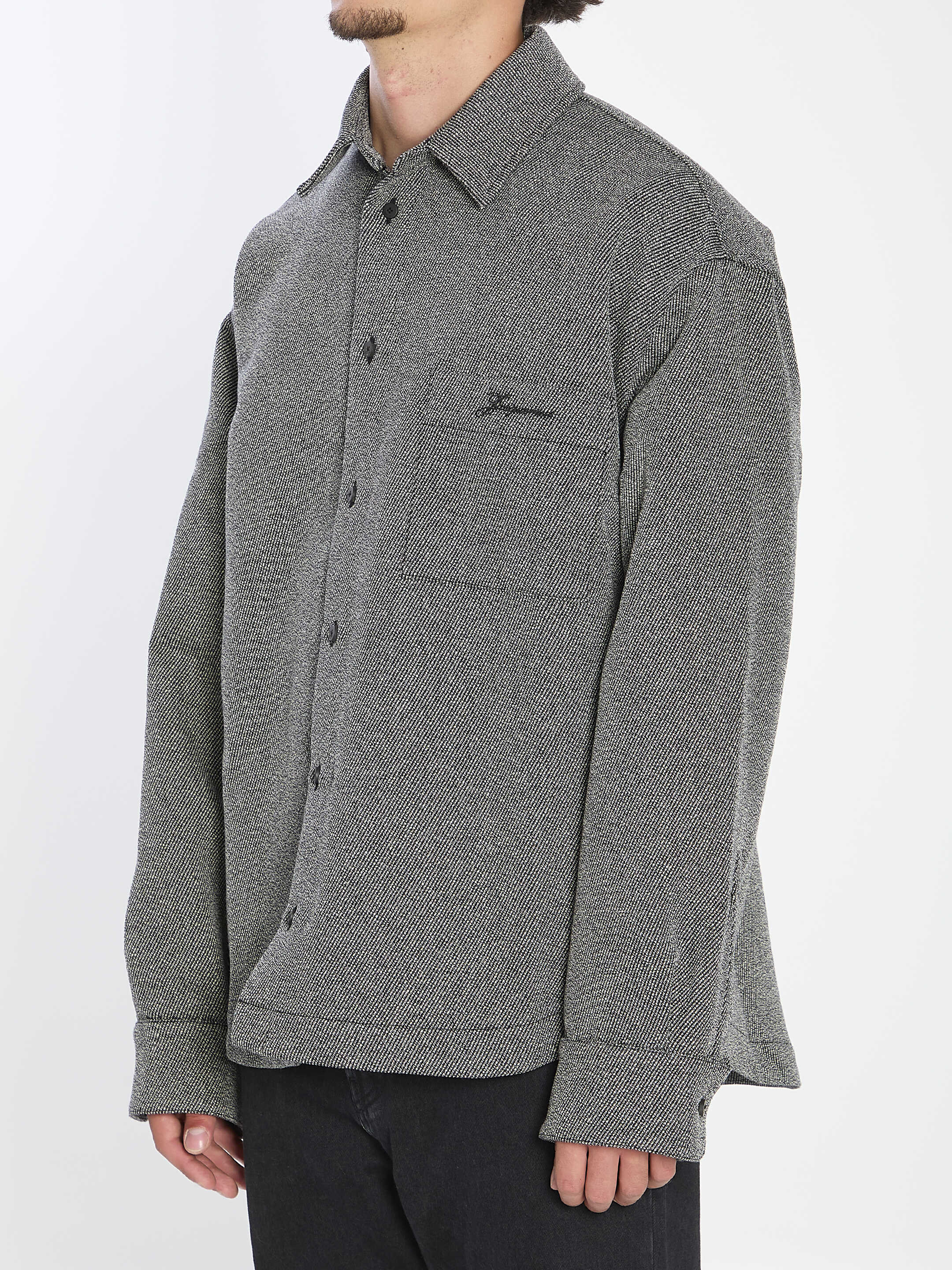 Shirt in a virgin wool and cotton blend in grey color. It features a pointed collar, front button closure, chest pocket with Jacquemus signature, long sleeves with buttoned cuffs, J appliqué on the back, rounded hem, and small side slits. Oversize fit.