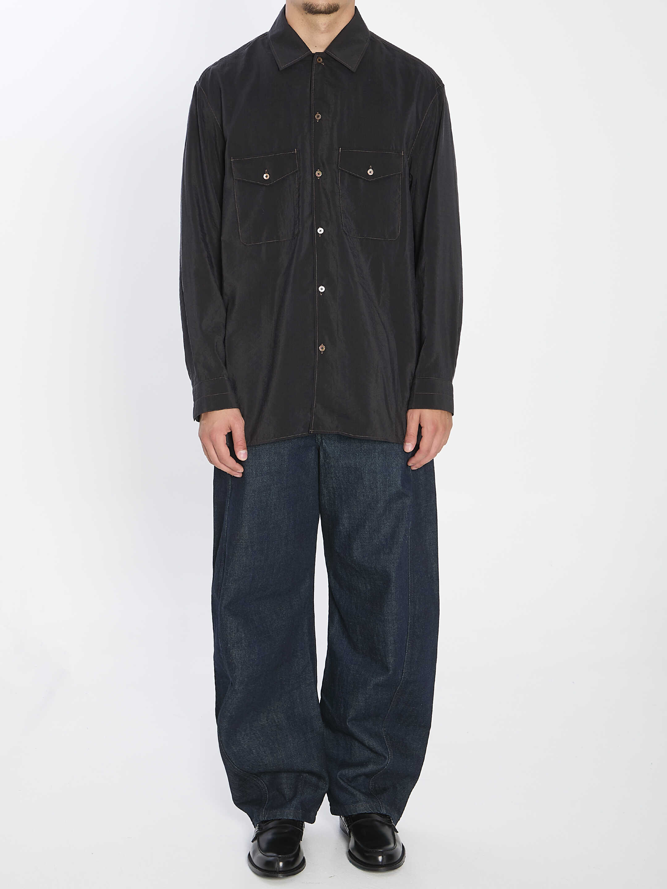 Shirt in a black silk and nylon blend. Features a convertible collar that can be worn open for a deeper neckline, front button closure, long sleeves with straight buttoned cuffs, chest patch pockets with flaps and buttons, side slits at the hem, and a flat pleat at the back. Slightly crinkled effect. Regular fit.
