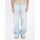 Light wash cotton denim jeans. Features belt loops, mid-rise waist, button closure, five pockets, logo patch on the back. Distressed and worn effect with a rip on the back. Relaxed fit.