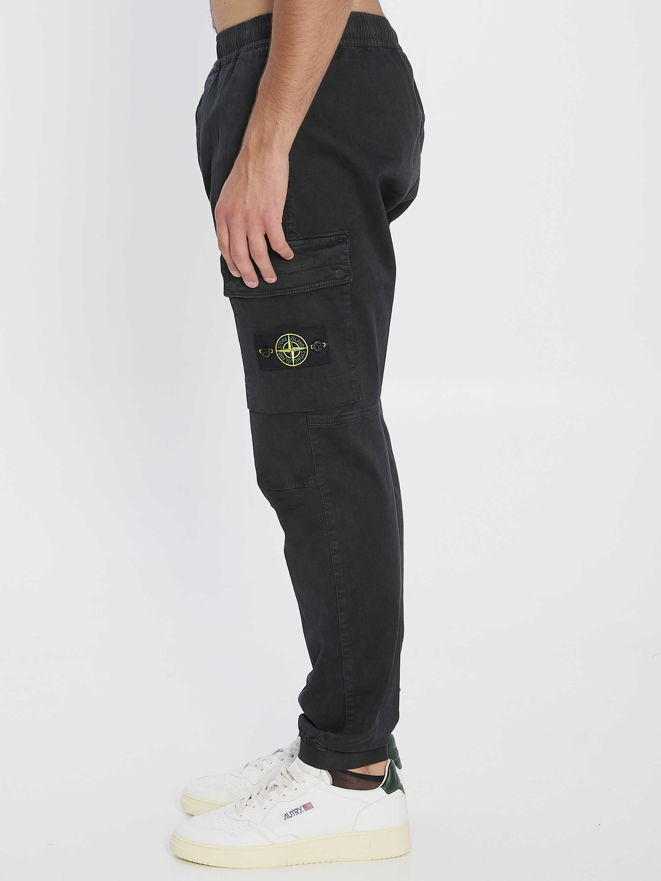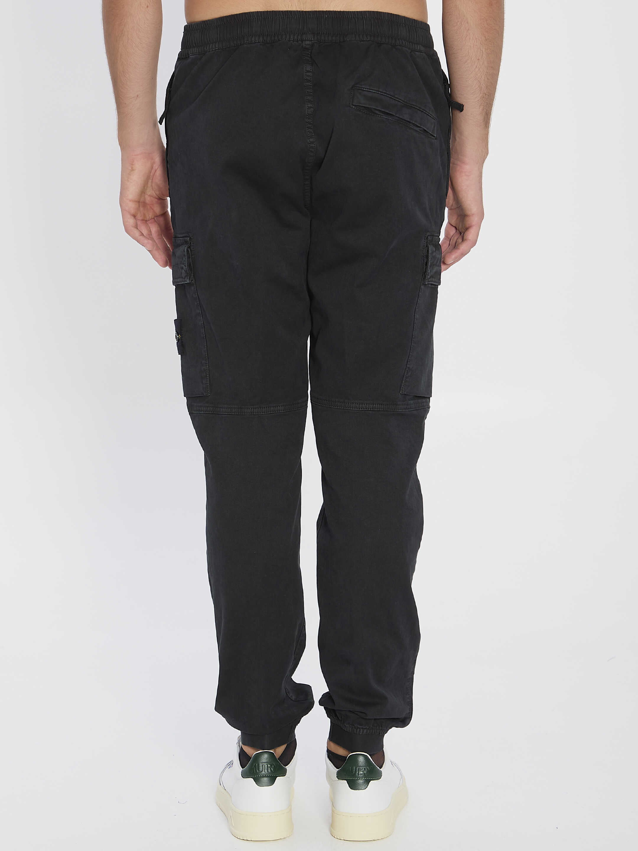 Cargo pants in stretch organic broken cotton twill in black. Features elastic waistband with internal drawstring, zip fly closure, two zippered front pockets, two side flap pockets, one welt pocket on the back, and elasticated cuffs. Garment-dyed with a vintage effect. Regular fit.