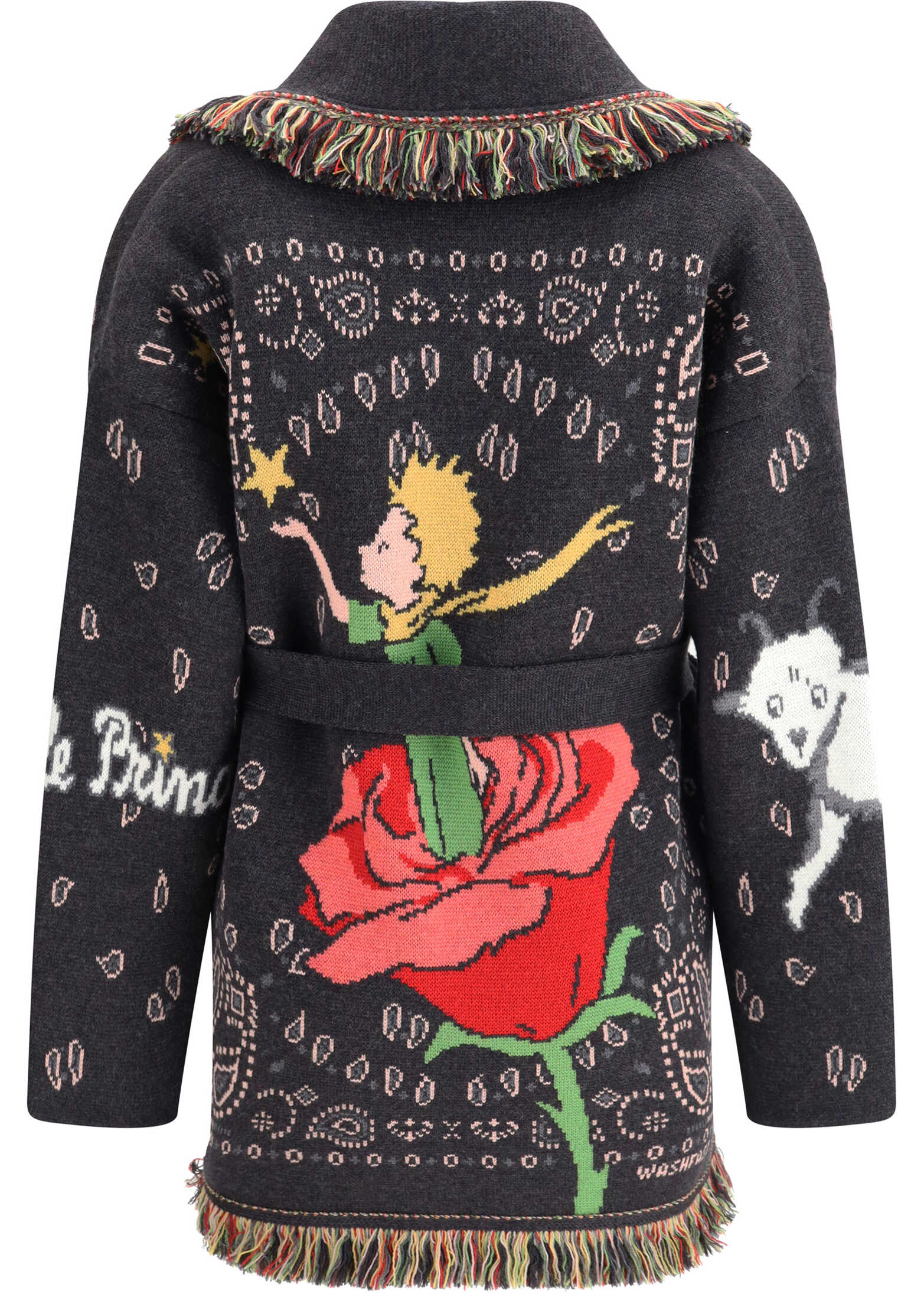 Alanui's The Little Prince Cardigan is an iconic and meaningful garment designed to accompany every adventure. Made of ultra-soft virgin wool with double jacquard work, it is embellished with illustrations inspired by the famous tale by Antoine de Saint-Exupéry. Completing the design are the two-tone waist belt and multicolored fringed edges, which add a handcrafted and distinctive touch to this timeless piece.