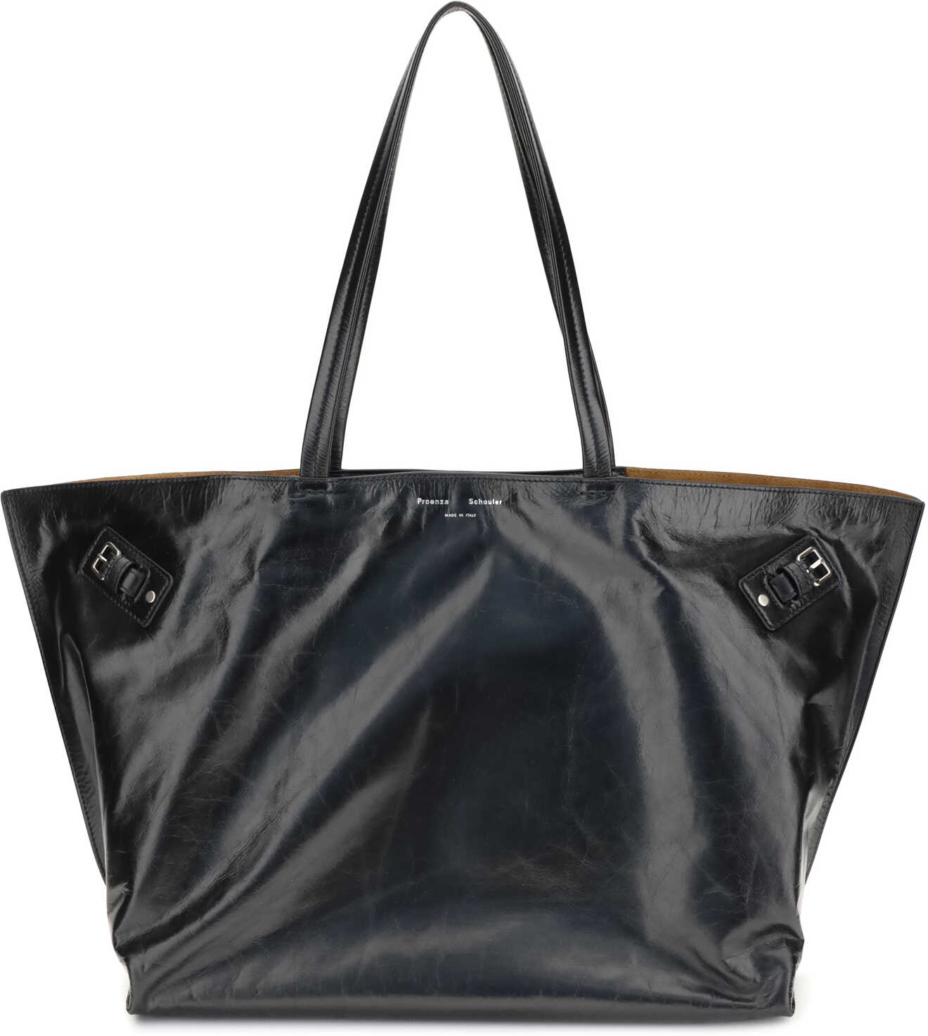 Proenza Schouler's Days Carryall Tote Bag is made of smooth calfskin with a soft, glossy finish. Featuring a spacious and functional design, it has silver-tone side buckles that allow you to fold the corners or wear it loosely for a relaxed look. Featuring a magnetic top closure, it includes an interior monogrammed zipper pocket, two patch pockets, a leather base panel and silver-tone exterior logo.