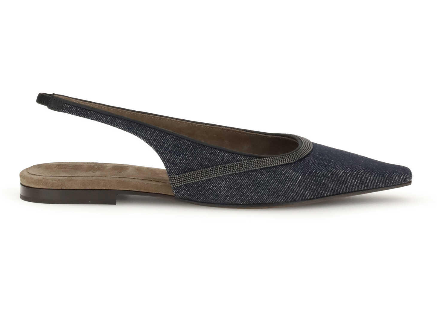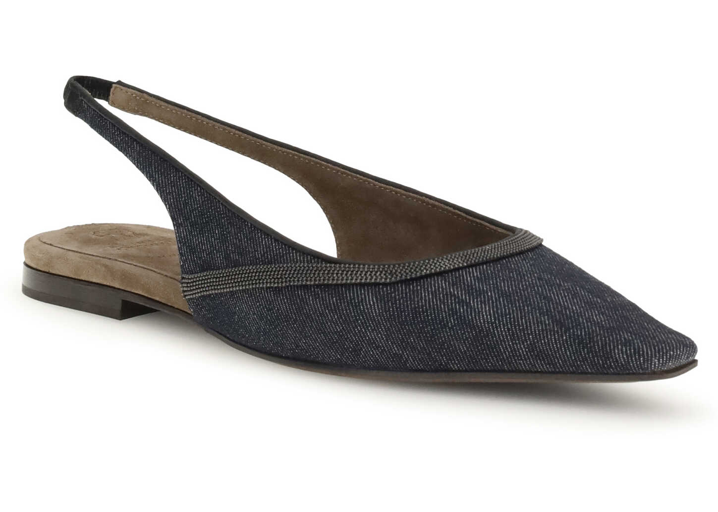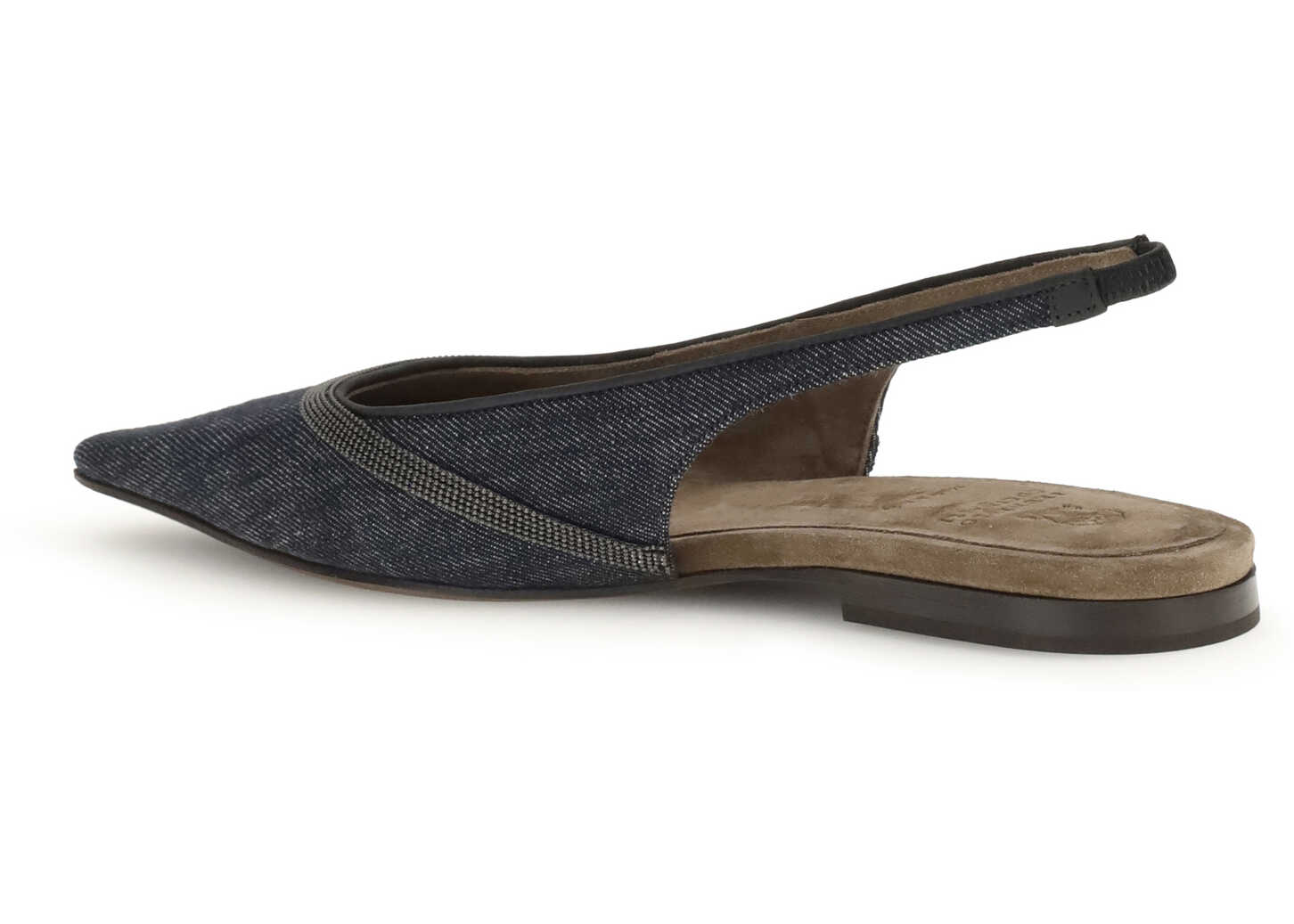 Brunello Cucinelli's denim slingback Ballerinas combine casual elegance with refined details. Featuring a back elastic band, they have a soft suede lining and a leather sole with TPU slip-resistant rubber inserts on the heel and toe. The nickel-free jewel decoration adds a bright and distinctive touch, in perfect Cucinelli style.