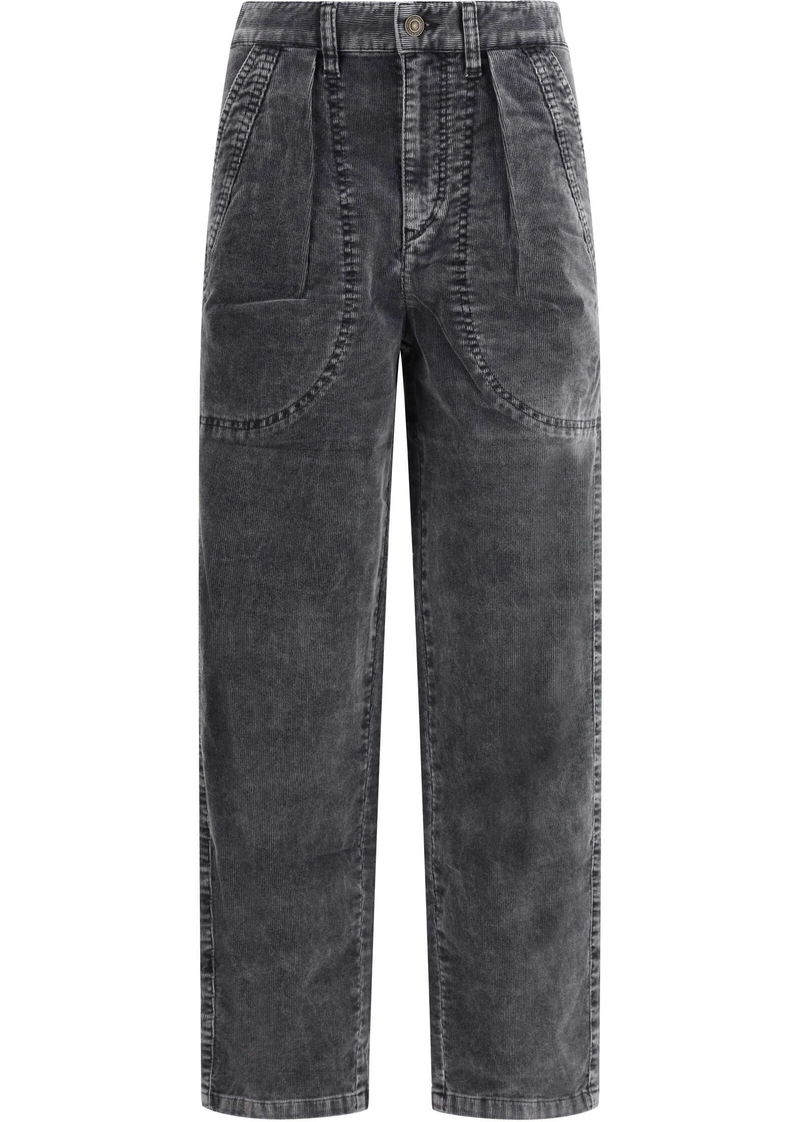 Marant Étoile's ribbed velvet Pants are made of délavé velvet and are distinguished by their refined casual style. They feature a waistband with belt loops, a metal button and covered zipper closure, and delicate pleating at the front. Side pockets with rounded topstitching and patch pockets on the back add a functional touch. The design is completed by a leather label with embossed "Isabel Marant" logo on the back, a regular waist, and a wide, tapered cut.
