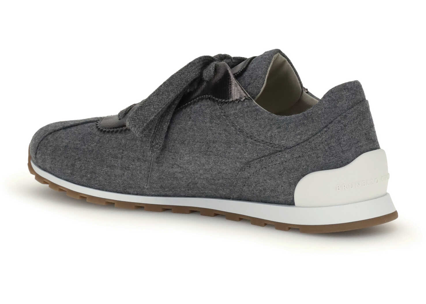 Virgin wool flannel Sneakers by Brunello Cucinelli combine craftsmanship and comfort in an essential and sophisticated design. The cashmere flat lace-up closure adds a premium touch, while the fabric lining and removable insole ensure a comfortable fit. The lightweight micro sole ensures lightness and flexibility, with a rise of about 2 cm at the highest point. Completing the look is a delicate nickel-free jewel decoration, an emblem of the house's refined style.