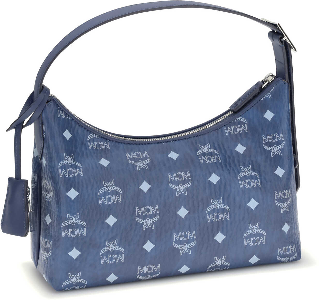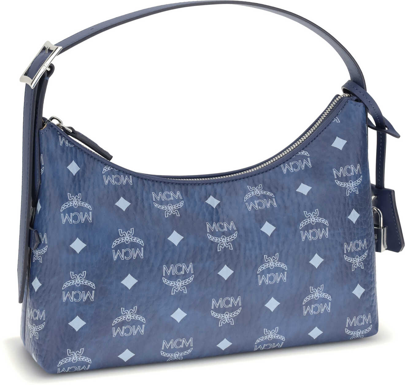 Aren Hobo Shoulder Bag by MCM, adjustable flat shoulder strap, zippered top closure, interior zippered welt pocket, single compartment, hammered weave, iconic brand monogram printed with all-over contrasting pressure print, padlock detail.