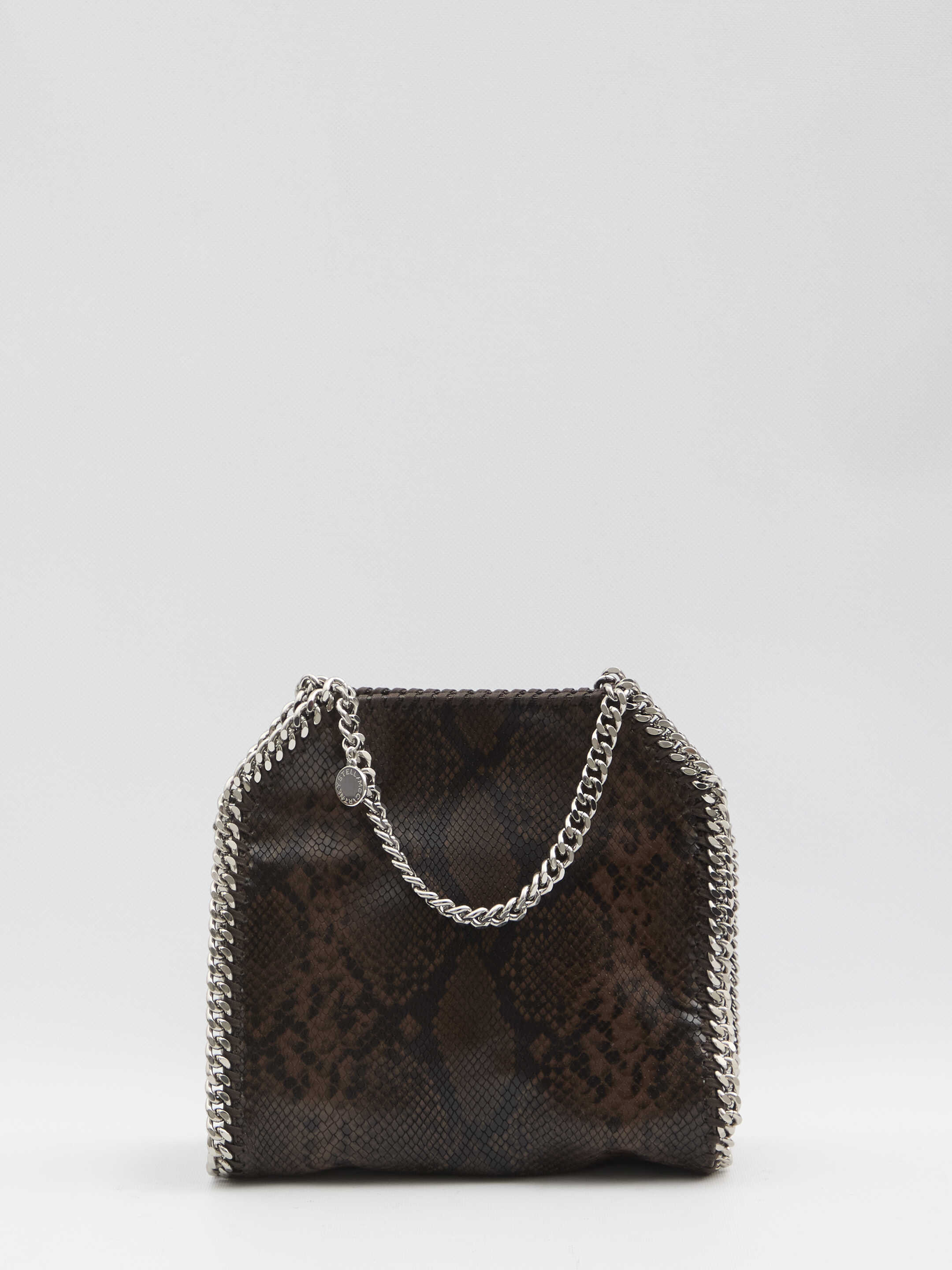 Mini Falabella tote bag in in brown-toned vegan snake-effect fabric. Featuring double chain handles with logo charm in rhutenium, diamond-cut chain shoulder strap, snap-button closure, main internal compartment, and one open internal pocket. Dust bag included.
