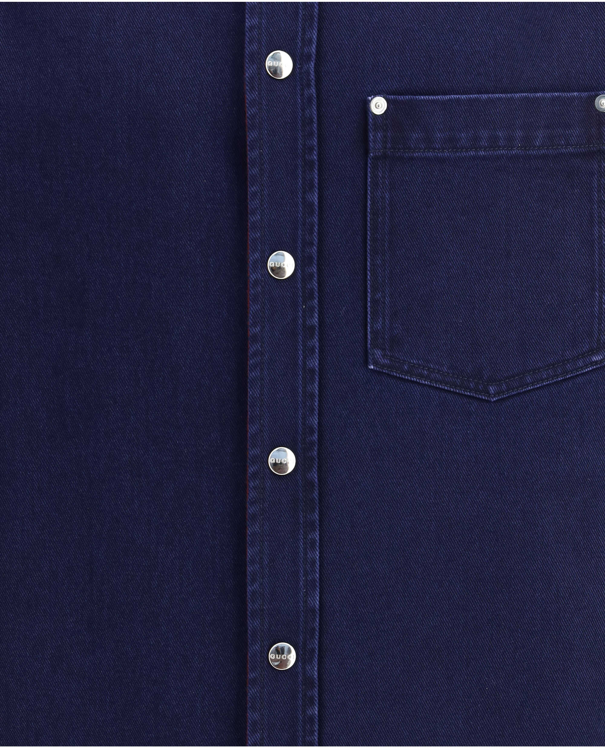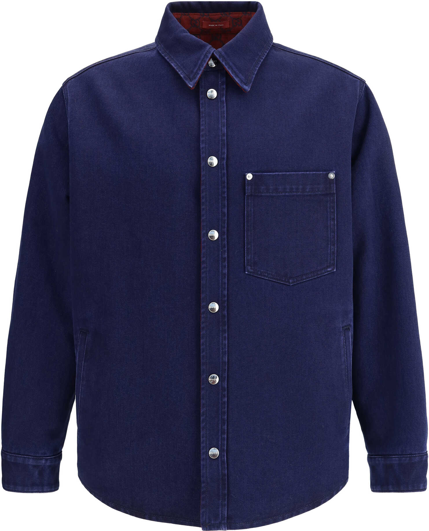 Gucci's reversible Shirt combines dark blue délavé denim on one side and soft red and blue brushed GG flannel on the other. Featuring a pointed collar, chest pocket, side pockets and long sleeves, it has a front closure with Gucci metal buttons. A distinctive detail is the embossed Gucci label on one side, which adds a touch of elegance to the versatile garment.