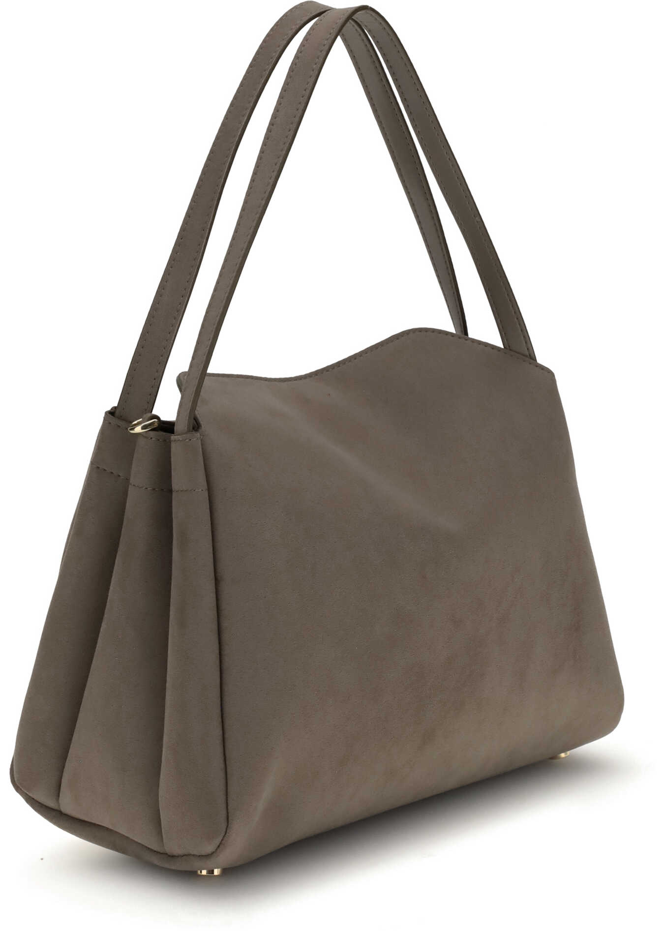 Eudora Shoulder Bag by Themoirè is a modern, sustainable design accessory made from vegan suede. Featuring a trapeze silhouette, it has two leather handles that complement its elegant aesthetic. The swivel closure adds a refined touch, while feet at the base provide stability and protection. A perfect balance of contemporary style and environmental awareness.