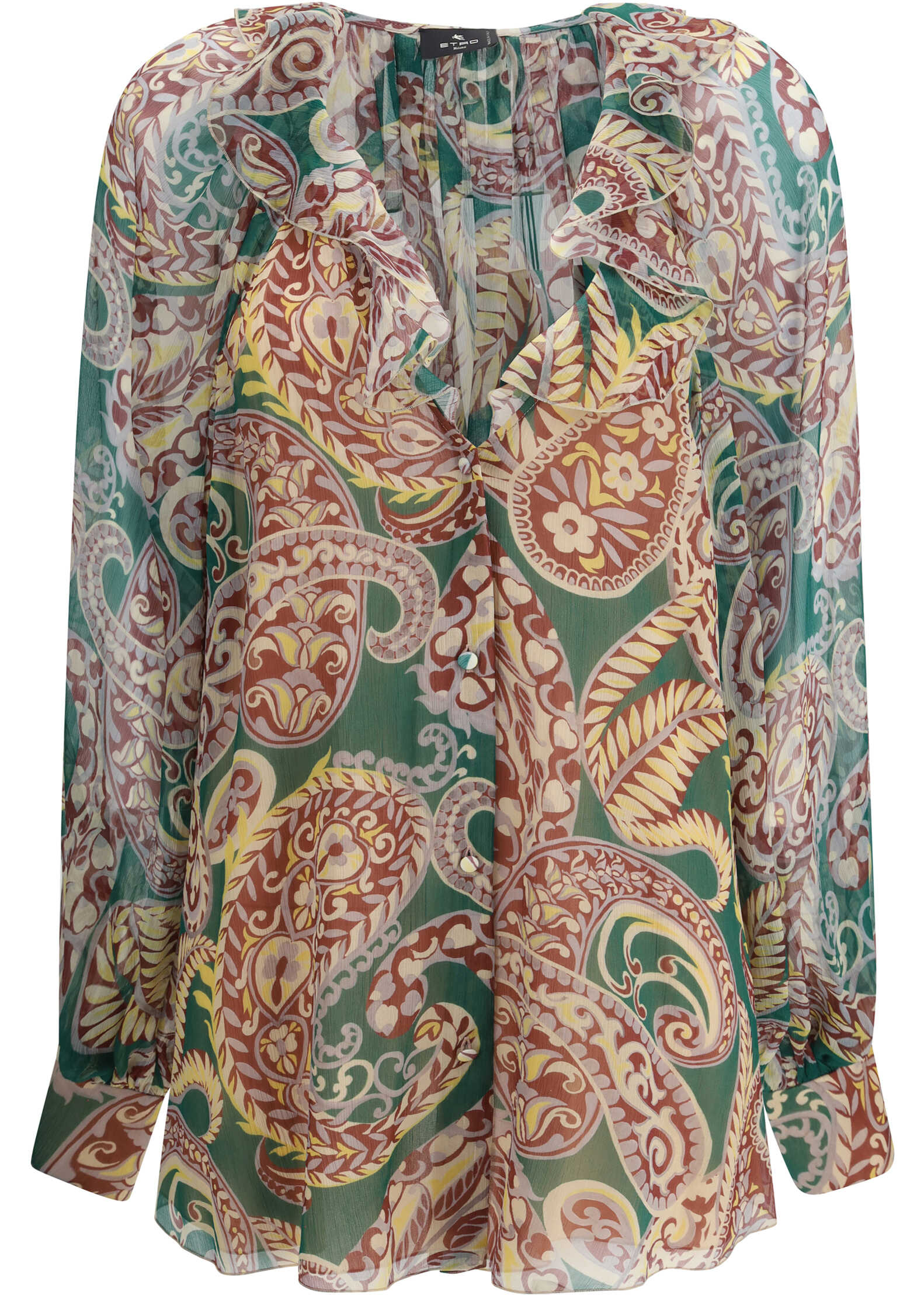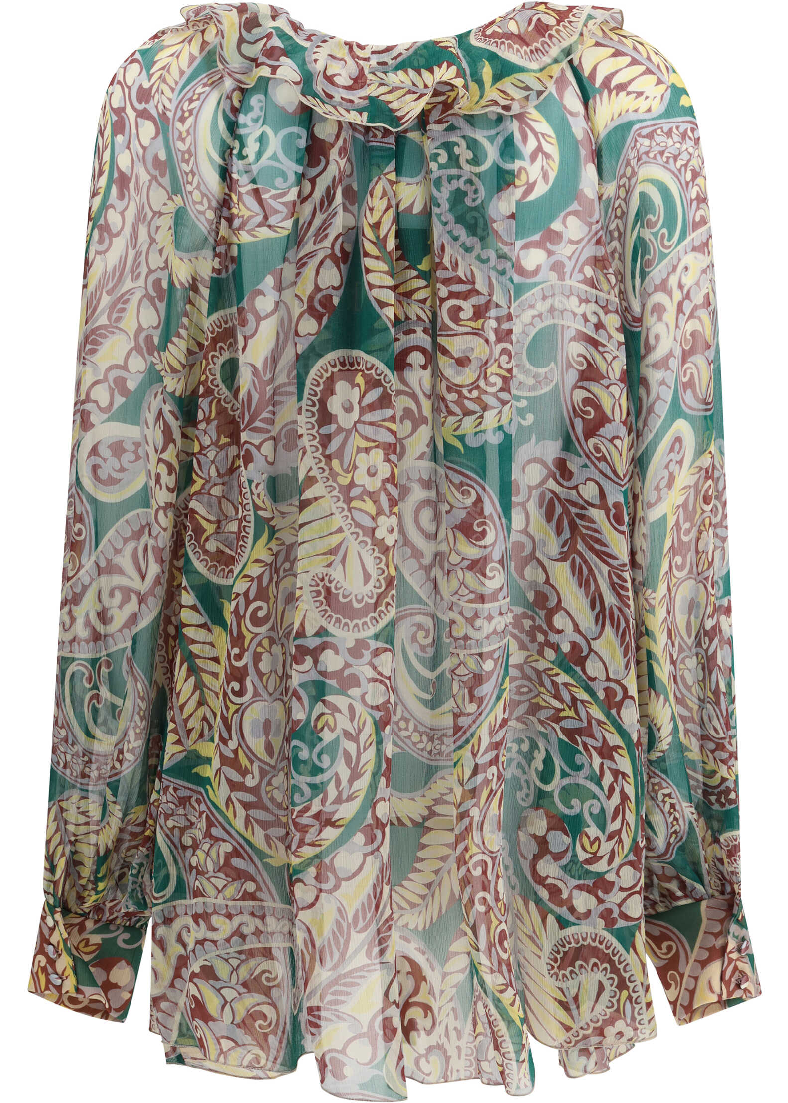 Made of lightweight silk crepon with a see-through effect, Etro's shirt is distinguished by its ethereal elegance and the house's iconic all over Paisley print. The deep V-neckline is enhanced by delicate tone-on-tone ruffles, while the wide long sleeves and asymmetric hemline give movement to the garment. At the back, soft pleats add volume and lightness. Completing the design is a covered button closure, in perfect harmony with the shirt's refined and feminine style.
