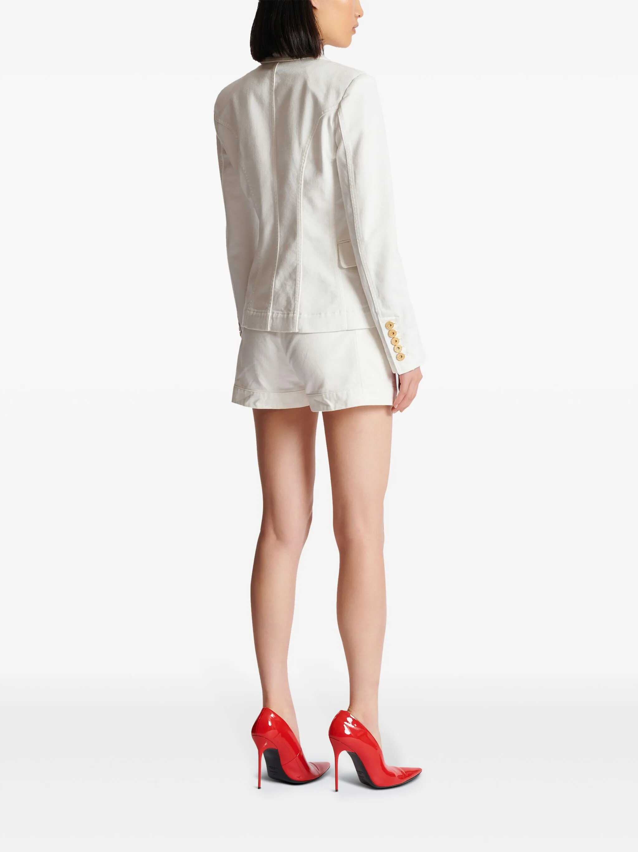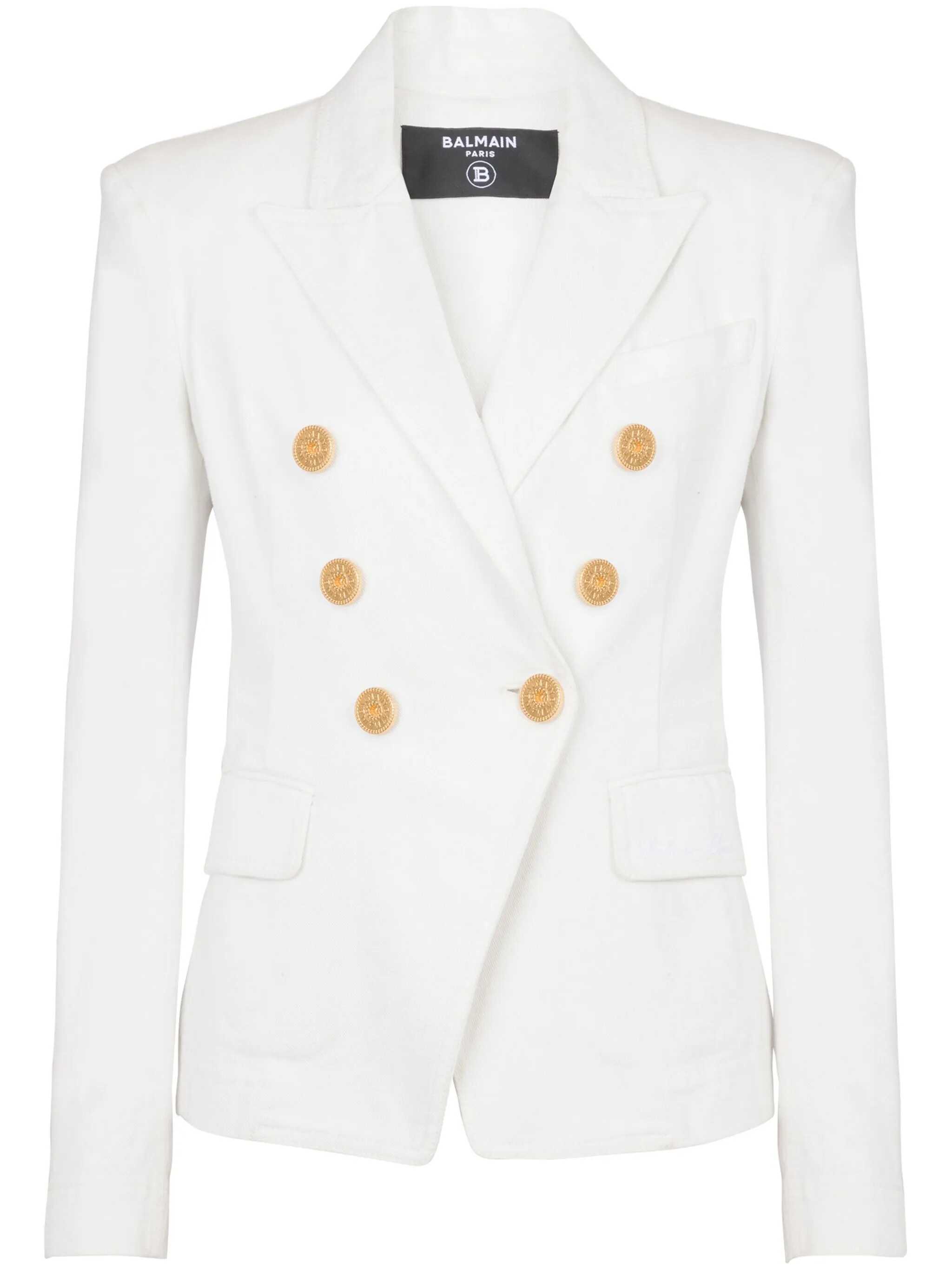Double-breasted blazer in cotton denim with metal logo button closure, pockets, padded shoulders, long sleeves