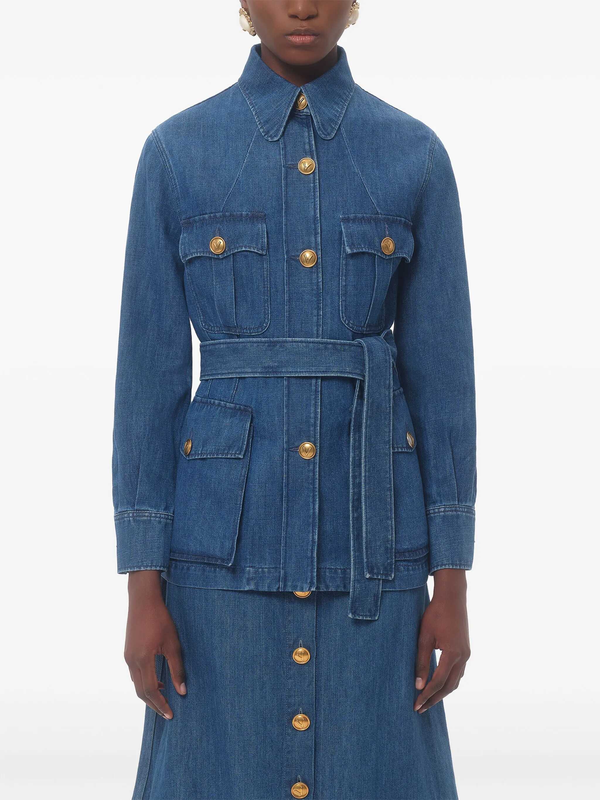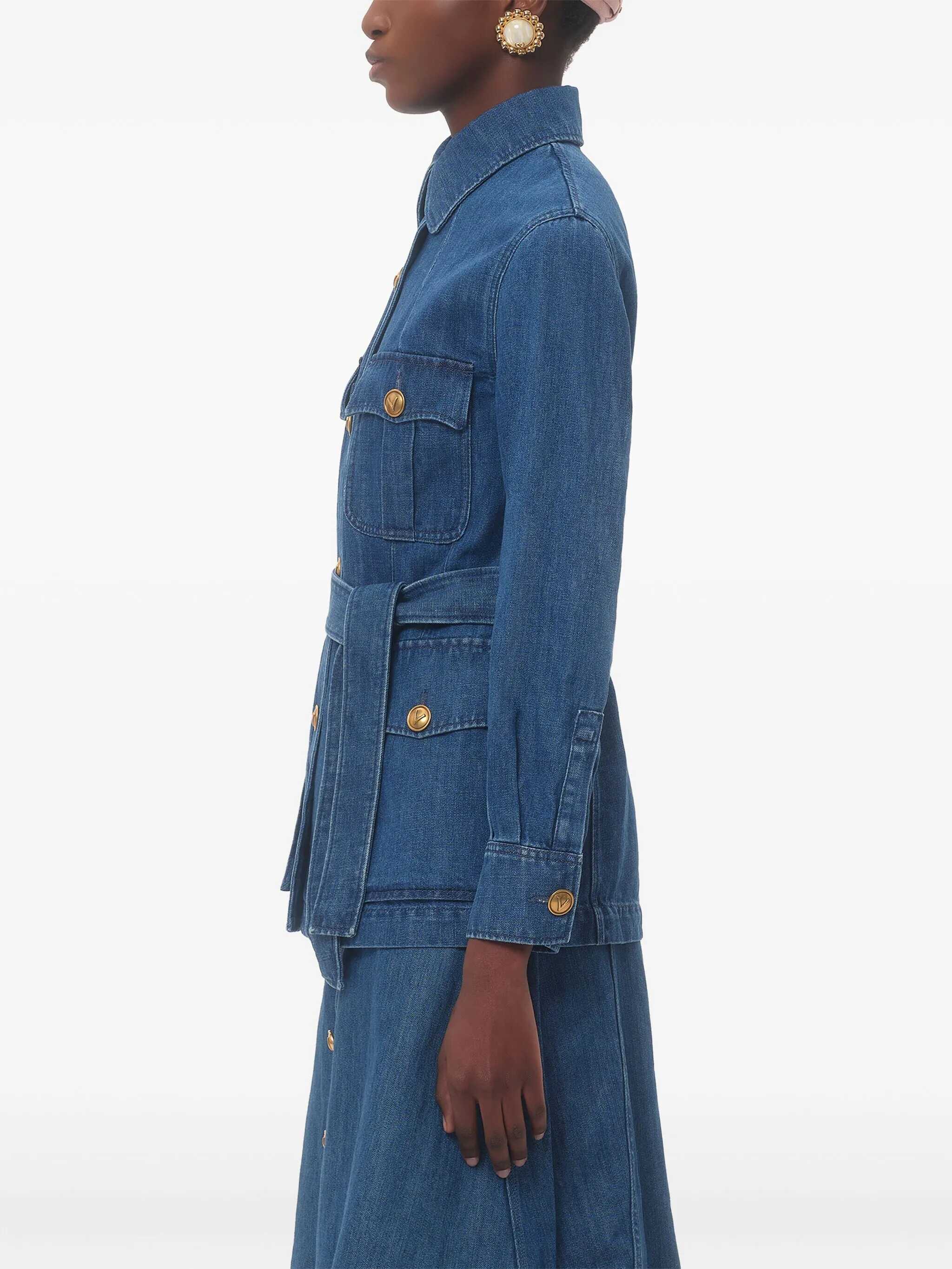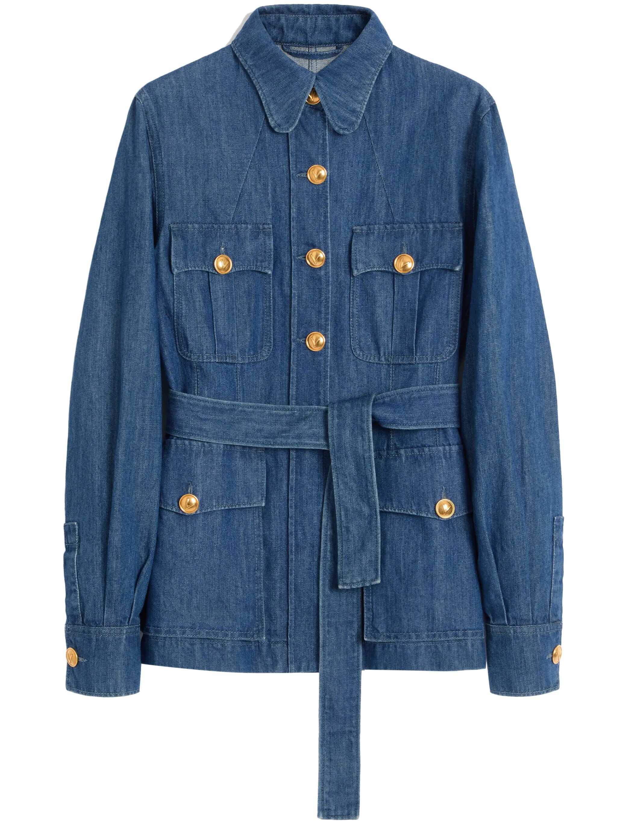 Delavé linen blend cotton denim jacket, Saharan design, unlined, front 'VLogo' button closure, pockets, long cuffed sleeves, back split, removable matching belt