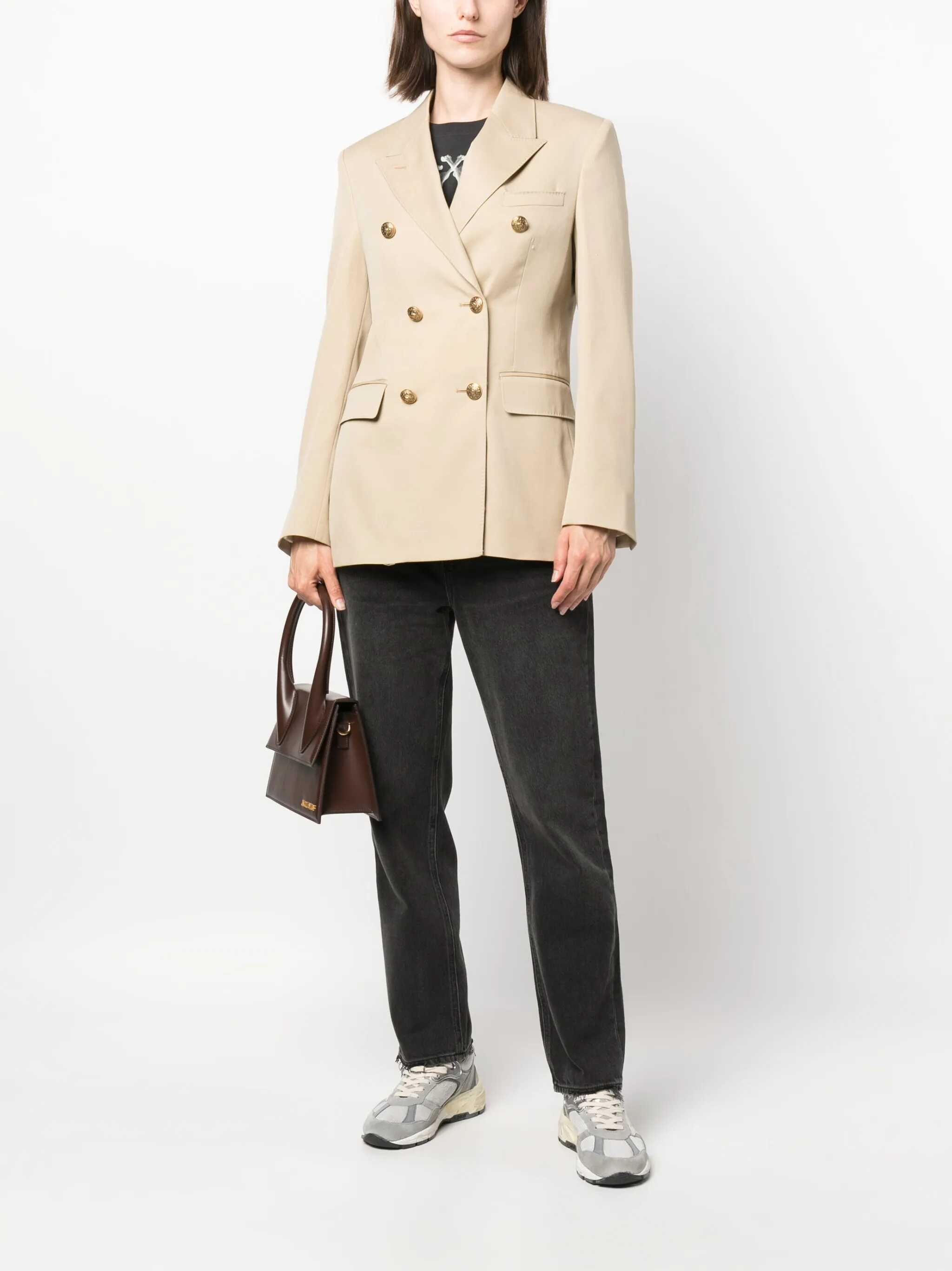 Double-breasted wool blazer with front heraldic button closure, viscose blend lining with written print, peak lapels, pockets, long sleeves with logo patch, side slits, slightly padded shoulders