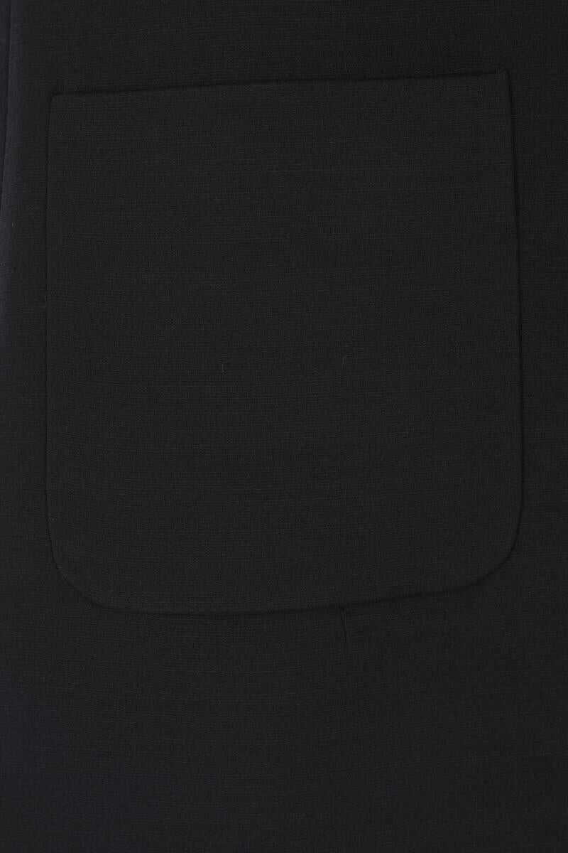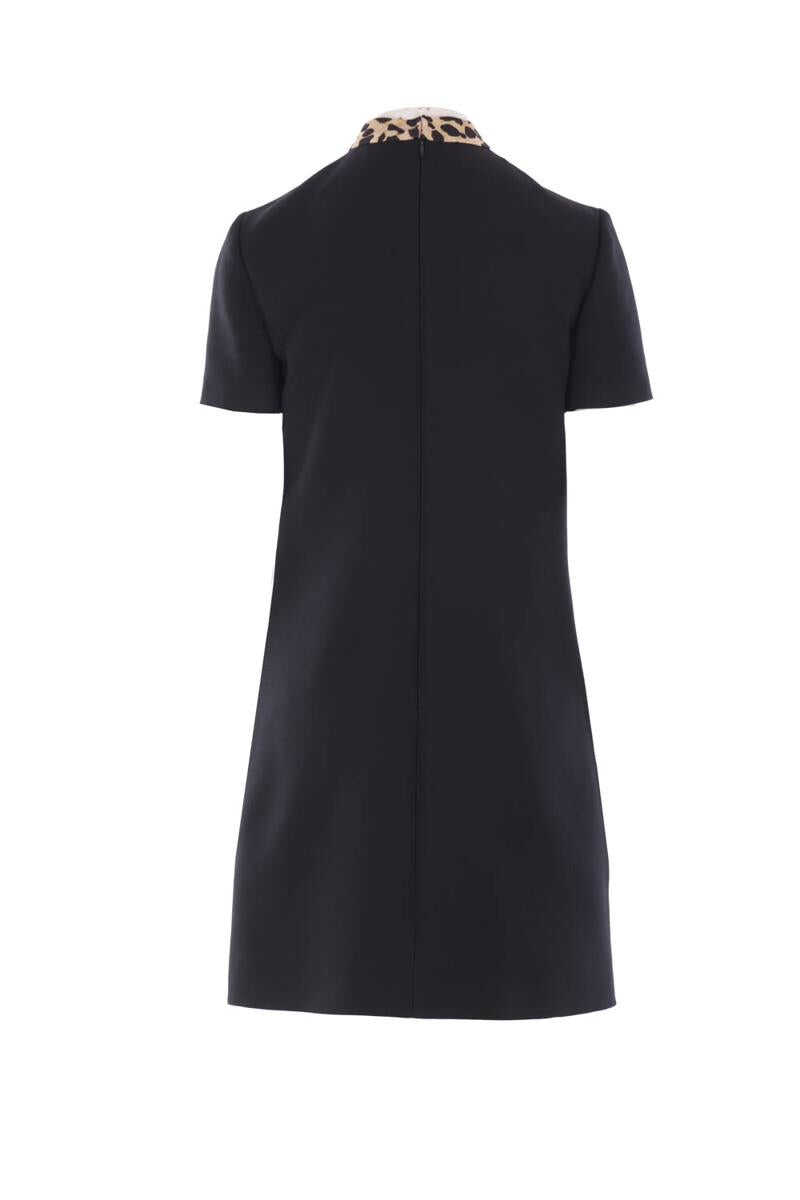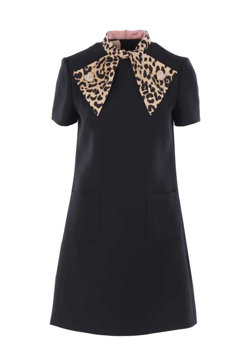 Valentino Garavani mini dress crafted from black Crepe Couture. Featuring a crew neckline adorned with an animalier printed bow and heart-shaped jeweled buttons, concealed back zip closure, short sleeves, front patch pockets, and a straight hem. Fully lined interior.